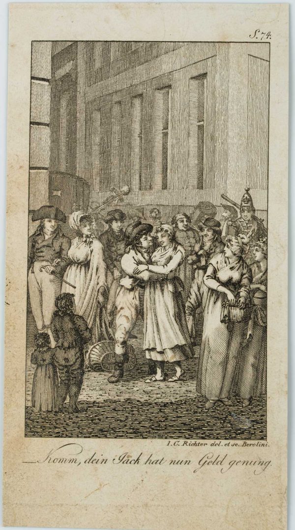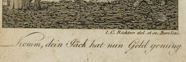 - Bezeichnung: Rechts unterhalb der Graphik signiert mit: “J. C. Richter del et sc. Berolini. Darunter bezeichnet mit: “Komm, dein Jack hat nun Geld genug.”. Oben nummeriert mit: “S. 74”.