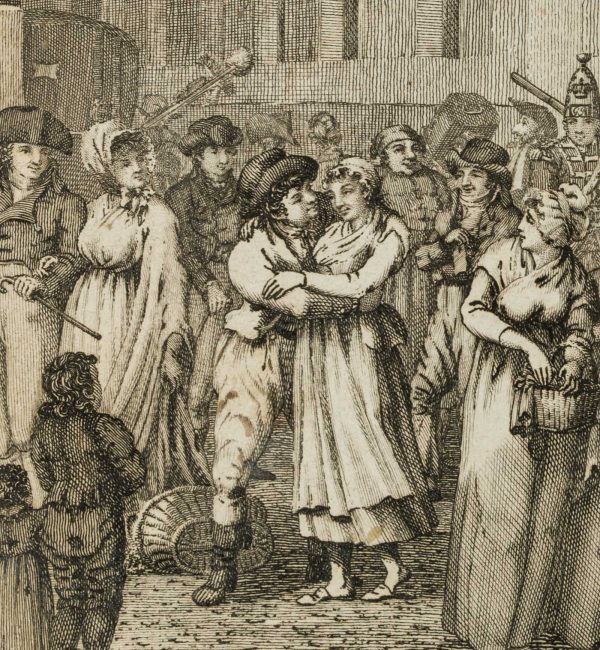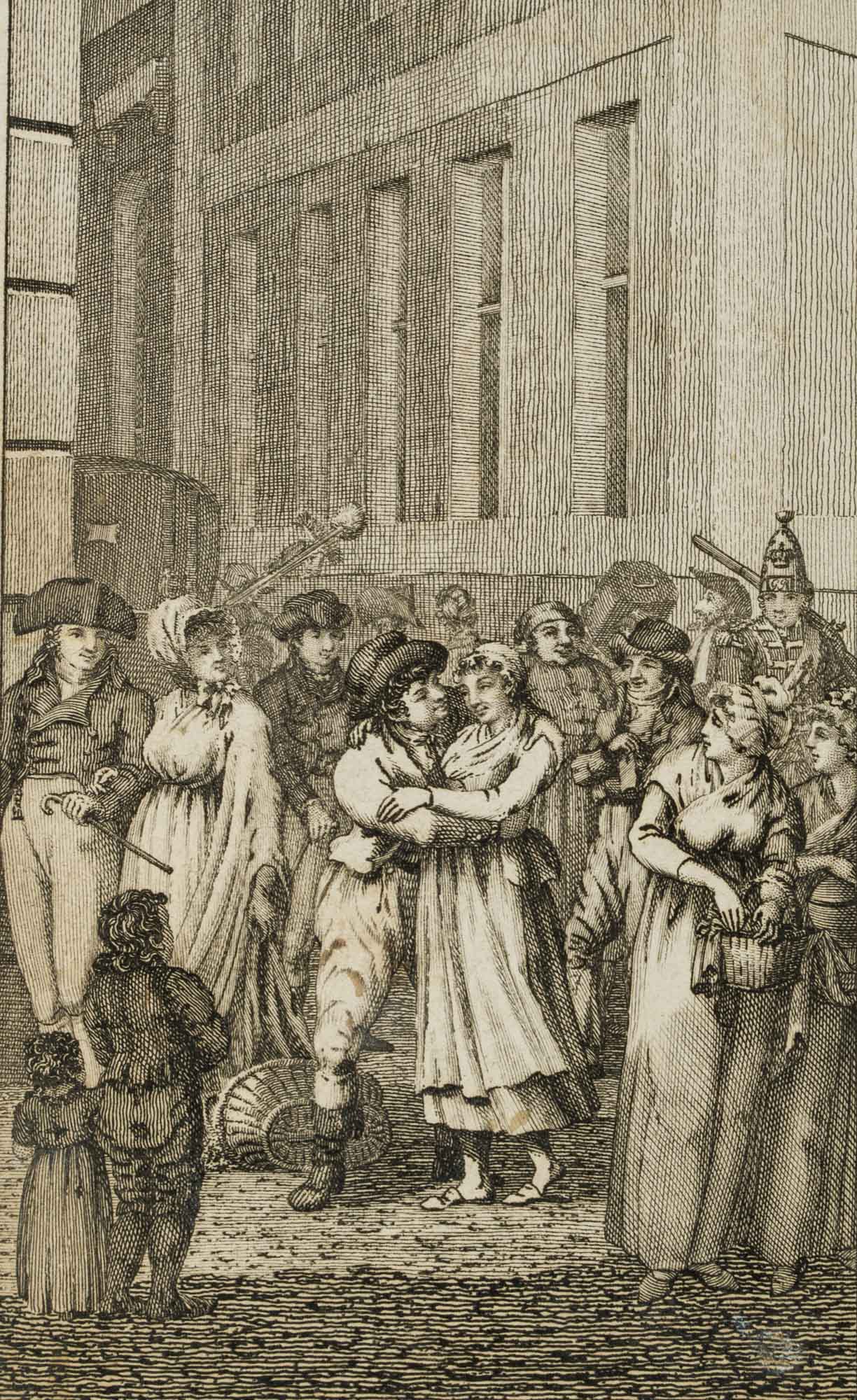 Johann Carl Richter (1759 Görlitz – um 1832 Berlin), Wankend umarmendes Paar, um die sich eine Menschengruppe gebildet hat, 18. Jahrhundert, Kupferstich