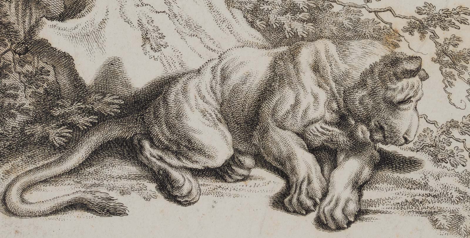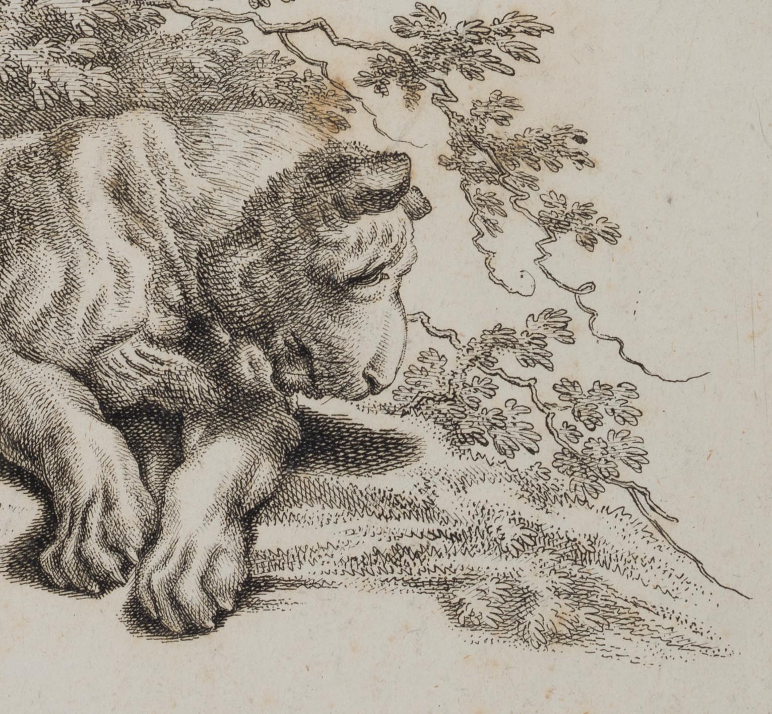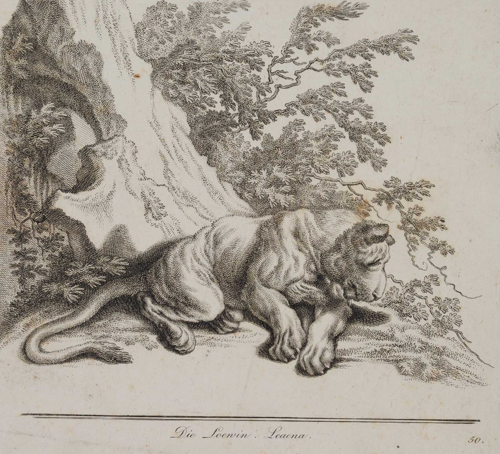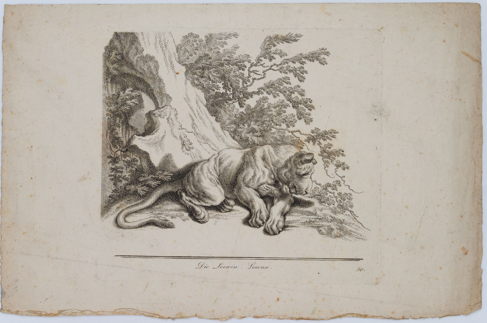 - Description: named “The Loewin. Leaena”. Depiction of a reclining lioness in front of a rocky outcrop, surrounded by bushes. The lioness seems to have picked up the scent, for she gazes attentively and intently at a point outside the picture space, invisible to the viewers.