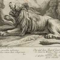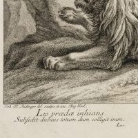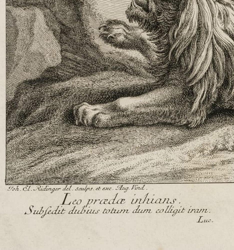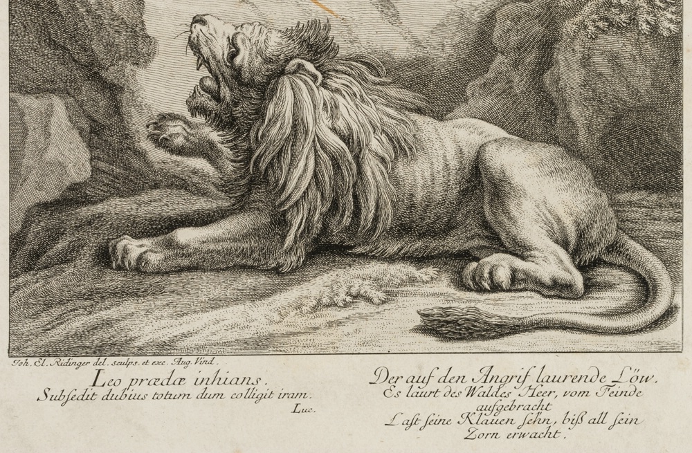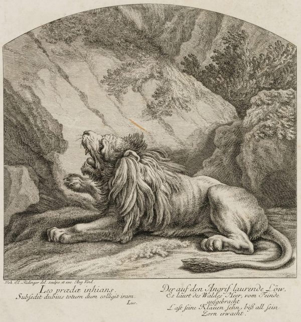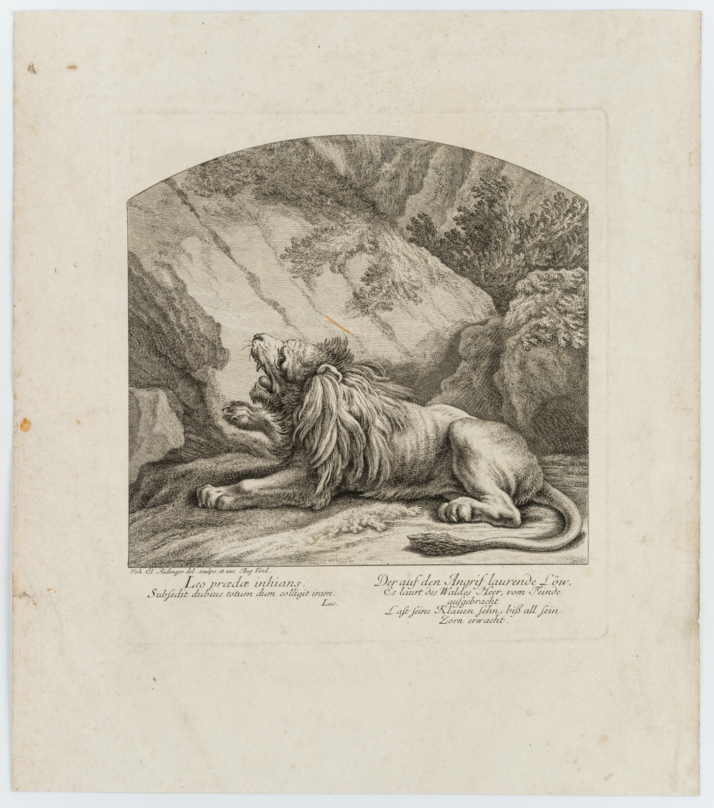 - Inscription: Signed and inscribed below in the printing plate: “Leo praedae inhians. Subsedit dubius totam dum colligit iram.Luc. The lion lurking on the attack. Es laurt des Waldes Heer (?) (Lord) vom Feinde aufgebracht. Let his claws see, until all his wrath awakes. From a series of eight lion depictions by Ridinger.