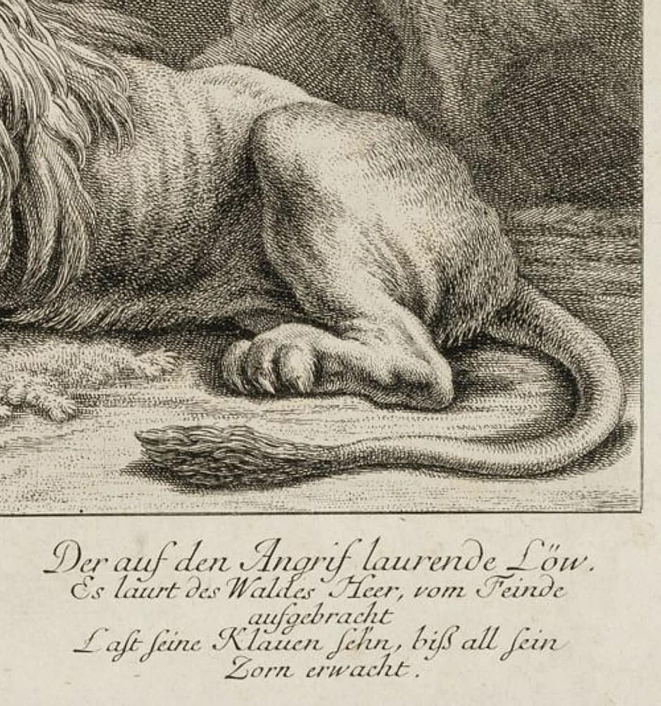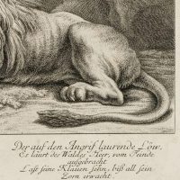 - Bezeichnung: Unterhalb in der Druckplatte signiert und bezeichnet: “Leo praedae inhians. Subsedit dubius totam dum colligit iram.Luc. Der auf den Angrif laurende Löw. Es laurt des Waldes Heer (?) (Herr) vom Feinde aufgebracht. Last seine Klauen sehn, bis all sein Zorn erwacht. Aus einer Serie von acht Löwendarstellungen von Ridinger.