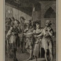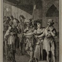 Johann August Rosmaesler (1752 Leipzig – 1783 Dresden), Buchillustration. Der Überfall. Soldaten, Bauerspaar, Sammlung Hasselmann, 19. Jahrhundert, Punktierstich