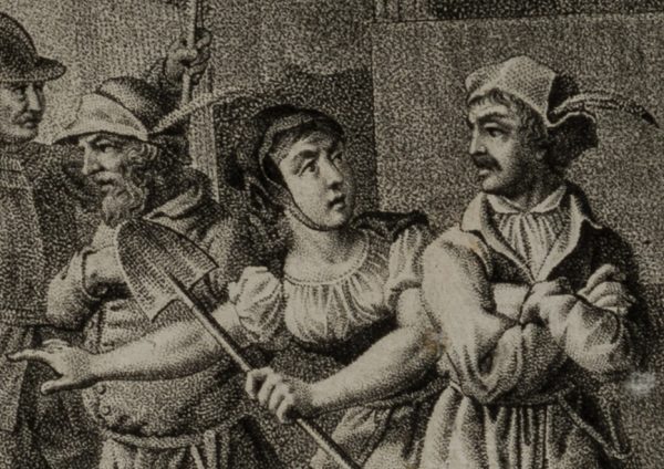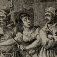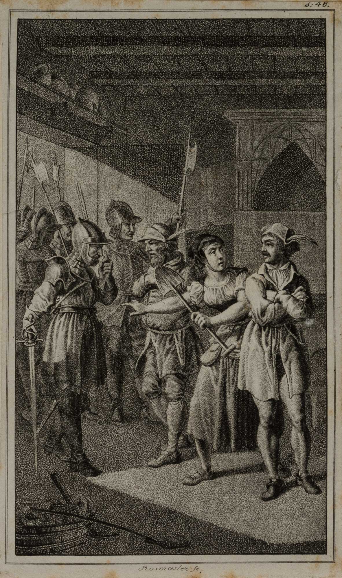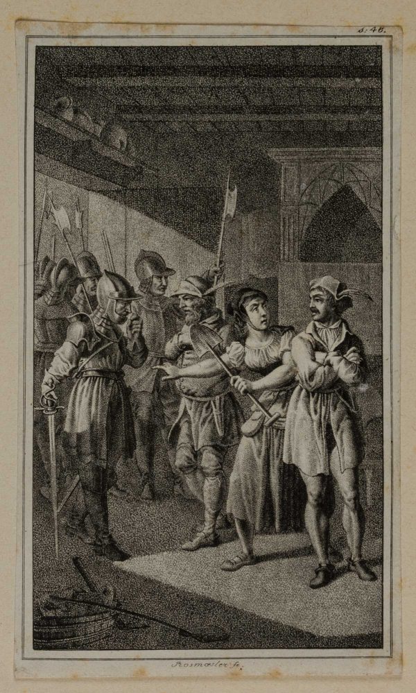 - Description: Miniature and illustration of contemporary literature. Signed in the plate below: “Rosmaesler fec.”.Johann Adolf Rosmäsler (1770 Leipzig – 1821 Leipzig). German engraver and etching artist, brother of Johann August Rossmäßler. Produced numerous portrait engravings in stipple style. Published the “Gründliche Anweisung zeichnen zu lernen” with a series of 24 sheets after Adam Friedrich Oeser (Leipzig: Carl Cnobloch 1812, 2nd edition 1832).The print comes from the collection of the Munich architect Fritz Hasselmann (1867-1925), with blue collector’s mark “F.H.” on the verso, Lugt number L.1012. From the famous house “Ludwig Rosenthal’s Antiquariat”, Munich.