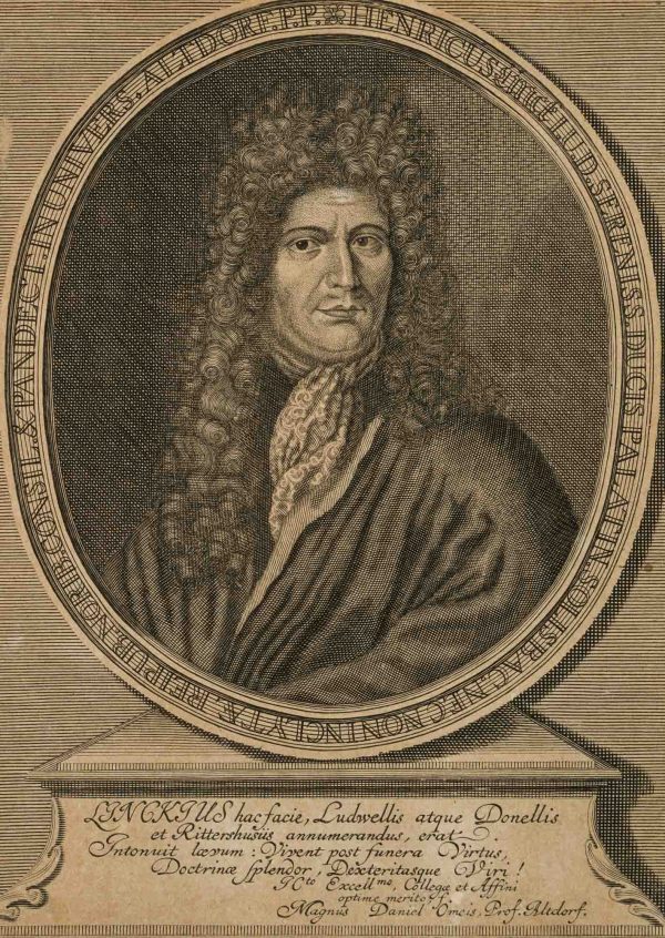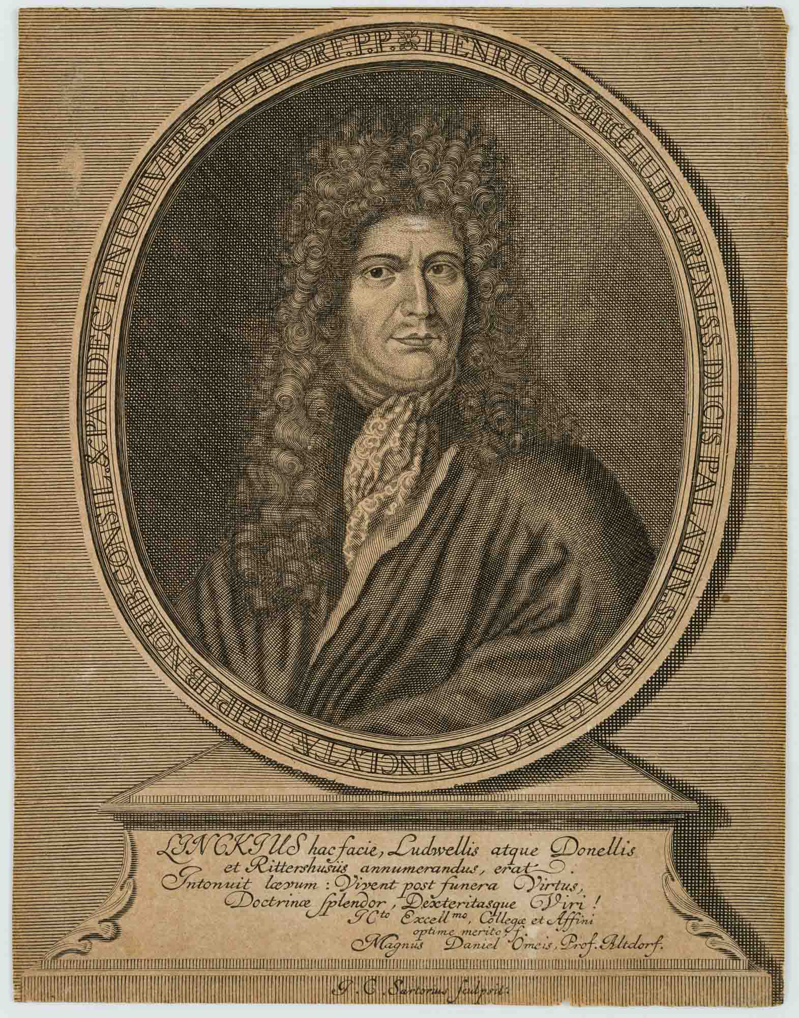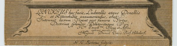 - Description: Half-length portrait in an oval written frame on a base. Latin oval inscription: “HENRICUS Linck I[uris] U[triusque] D[octor,] SERENISS[imi] DUCIS PALATIN[atus] SOLISBAC[ensis] NEC NON INCLYTAE REIPUB[licae] NORIB[ergensis] CONSIL[iarius] & PANDECT[arum] IN UNIVERS[itate] ALTDORF[ina] P[rofessor] P[ublicus].”Latin inscription on the pedestal: LINCKIUS hac facie, Ludwellis atque Donellis et Rittershusiis annumerandus, erat. Intonuit laevum: Vivent post funera Virtus, Doctrinae splendor, Dexteritasque Viri!”. Signed below with “J. C. Sartorius sculpsit:”.