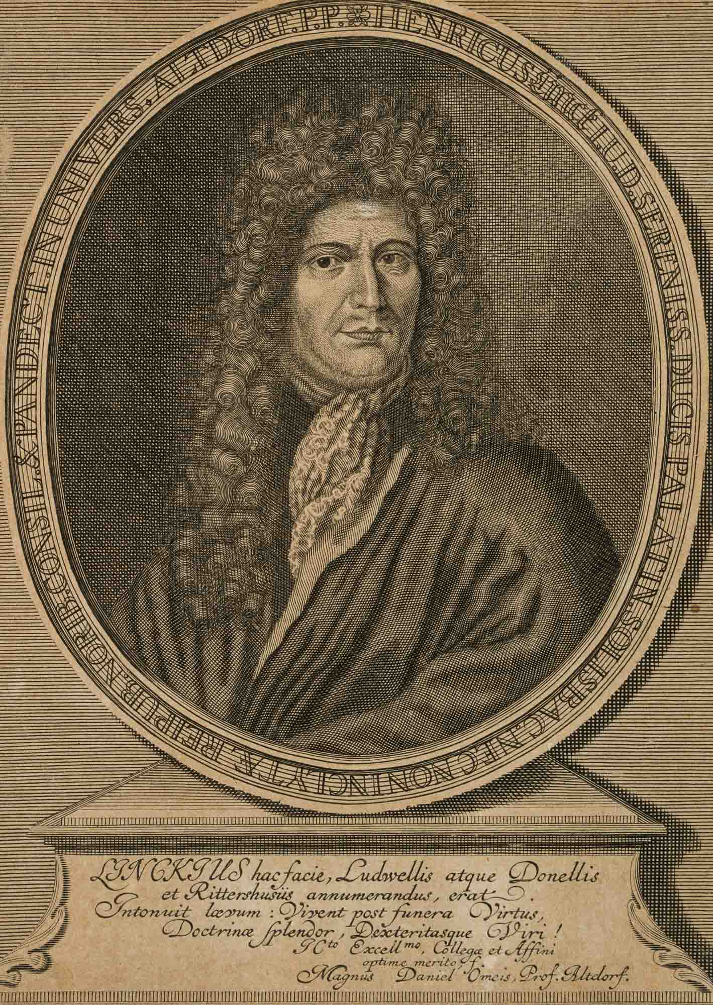 - Beschreibung: Brustporträt im ovalen Schriftrahmen auf Sockel. Lateinische Ovalumschrift: “HENRICUS Linck I[uris] U[triusque] D[octor,] SERENISS[imi] DUCIS PALATIN[atus] SOLISBAC[ensis] NEC NON INCLYTAE REIPUB[licae] NORIB[ergensis] CONSIL[iarius] & PANDECT[arum] IN UNIVERS[itate] ALTDORF[ina] P[rofessor] P[ublicus].“Lateinische Inschrift auf dem Sockel: LINCKIUS hac facie, Ludwellis atque Donellis et Rittershusiis annumerandus, erat. Intonuit laevum: Vivent post funera Virtus, Doctrinae splendor, Dexteritasque Viri!”. Darunter signiert mit “J. C. Sartorius sculpsit:”.