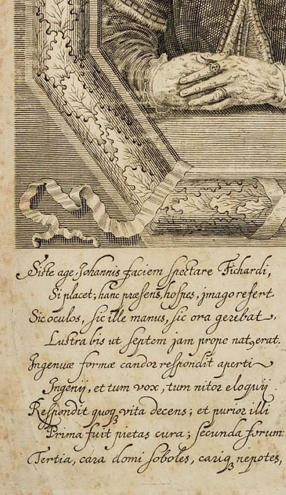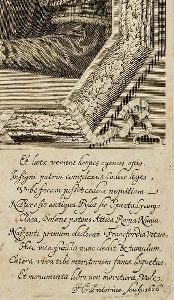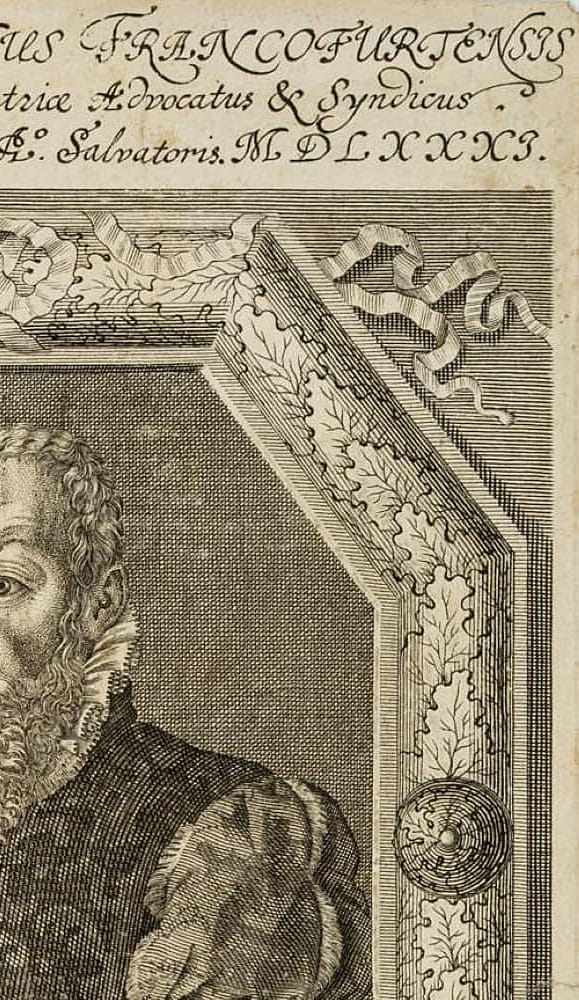 - Beschreibung: Brustbild im Halbprofil im Zierrahmen aus Eichenlaub. Zeigt den frühneuhochdeutschen Autor und Juristen Fischart im Alter von 69 Jahren im Jahre 1581. Er ist bekannt für das Werk Affentheurlich Naupengeheurliche Geschichtklitterung (1575) und das Frankfurter Zivilgesetzbuches Der Stadt Frankfurt erneuerte Reformation. Oberhalb und unterhalb der Darstellung in der Druckplatte mit Namen und Lebensdaten des Dargestellten sowie lateinischem Text bezeichnet.