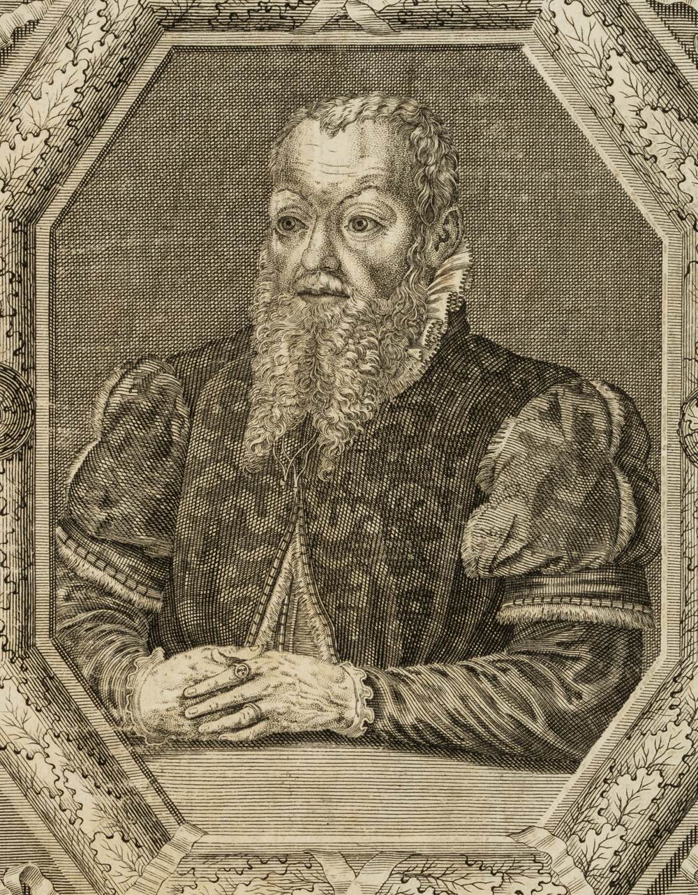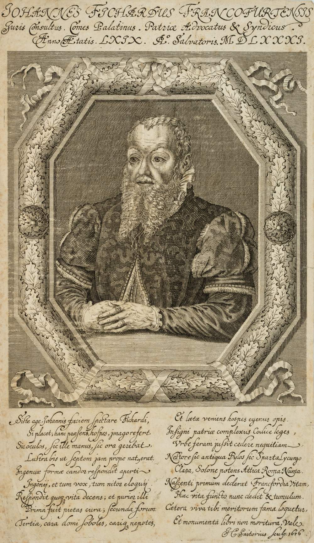 - Description: Half-length portrait in a decorative oak sheet frame. Showing the early New High German author and jurist Fischart at the age of 69 in 1581. He is known for the work Affentheurlich Naupengeheurliche Geschichtklitterung (1575) and the Frankfurt Civil Code Der Stadt Frankfurt erneute Reformation. Inscribed above and below the image in the printing plate with the name and life data of the sitter as well as Latin text.
