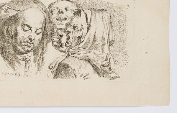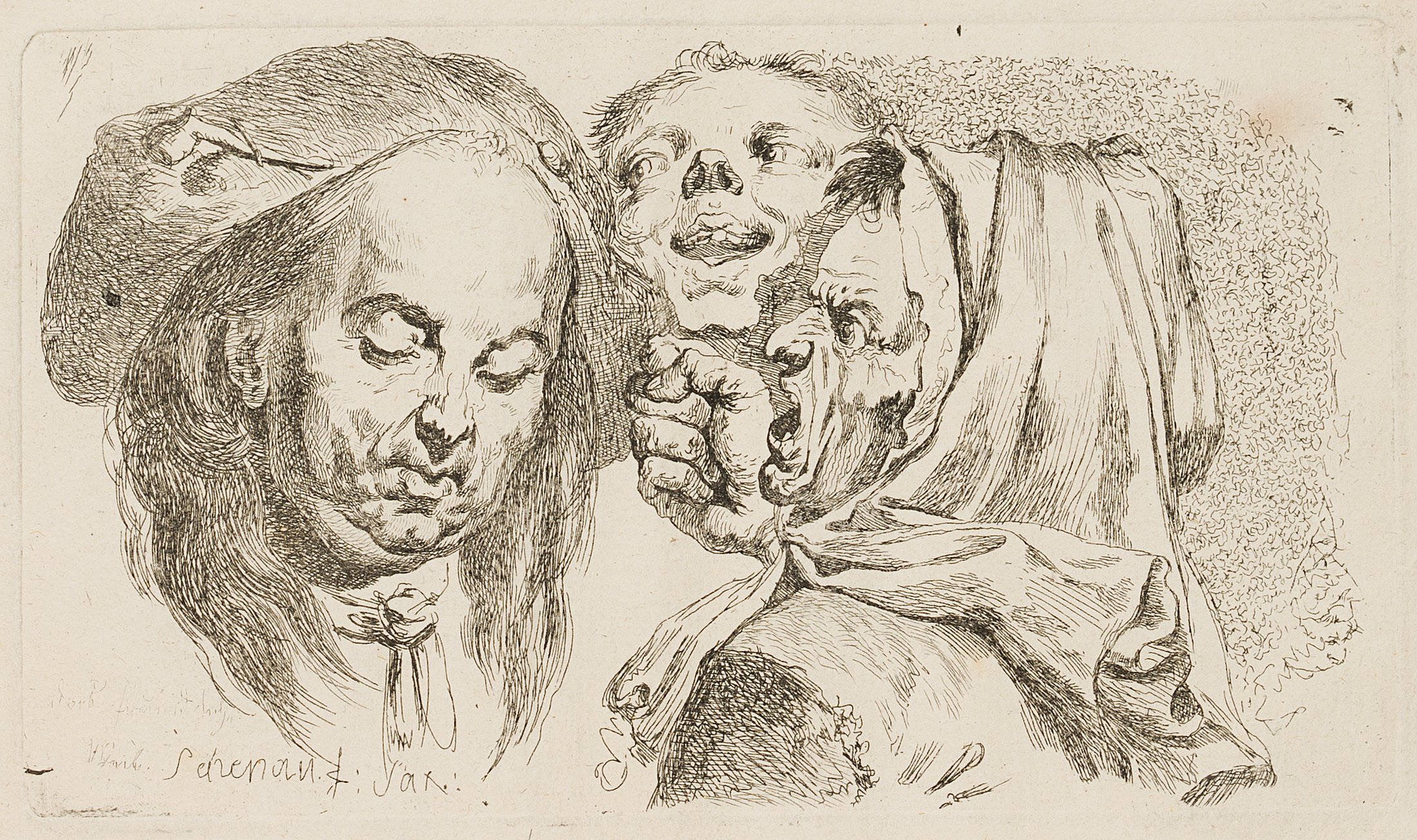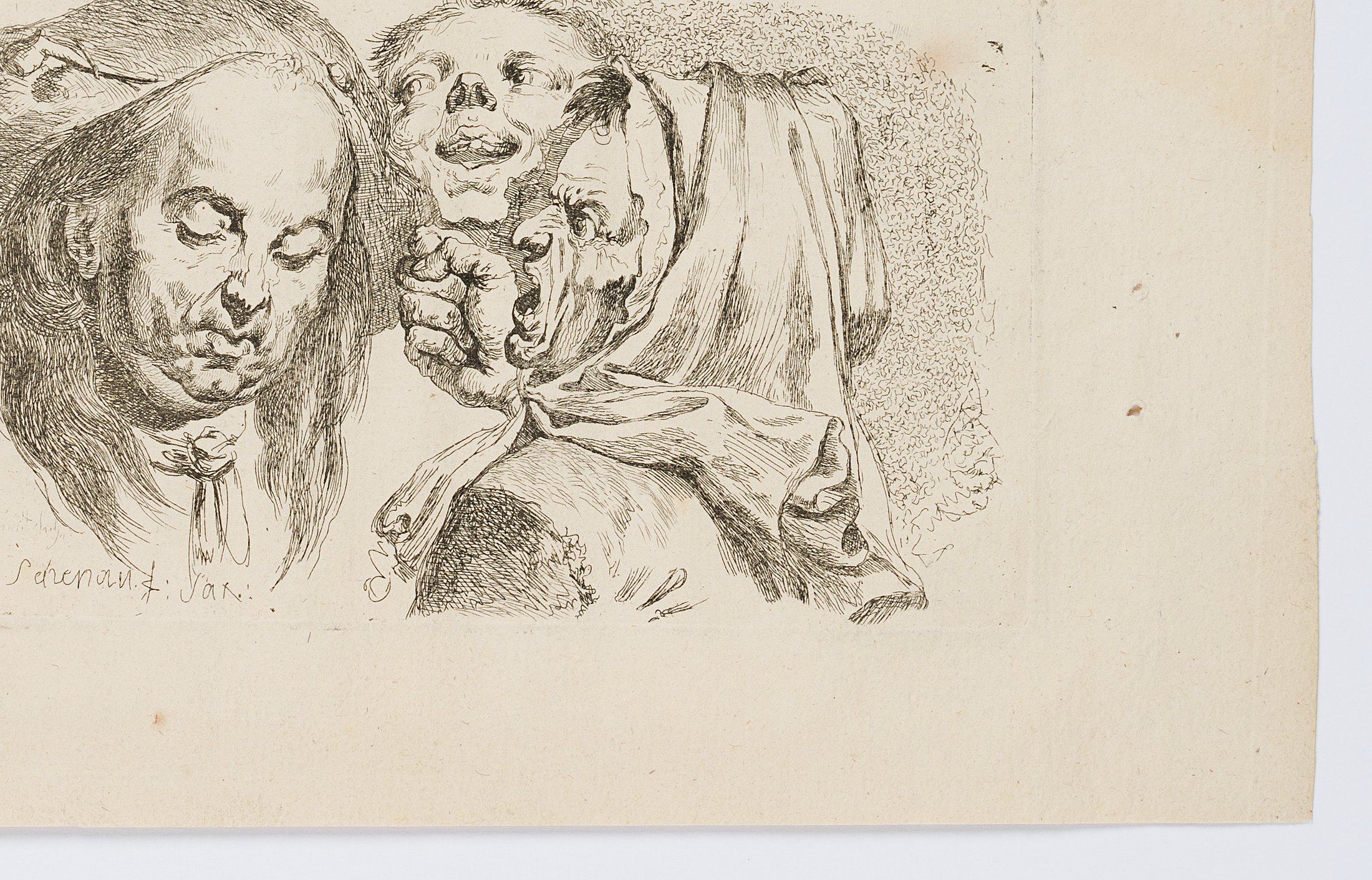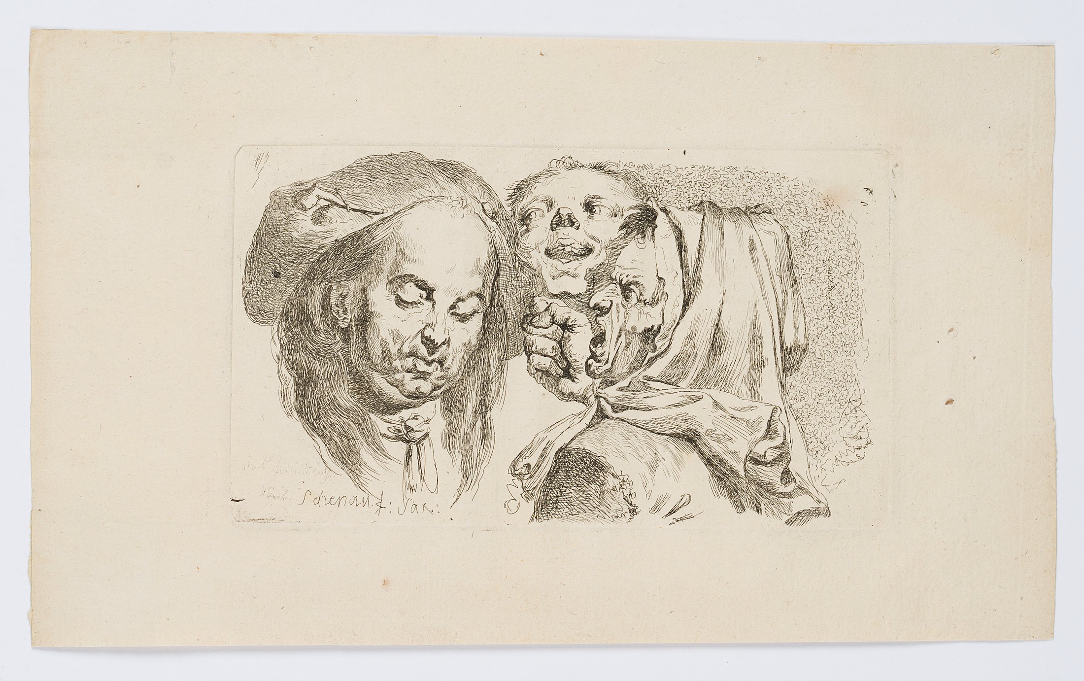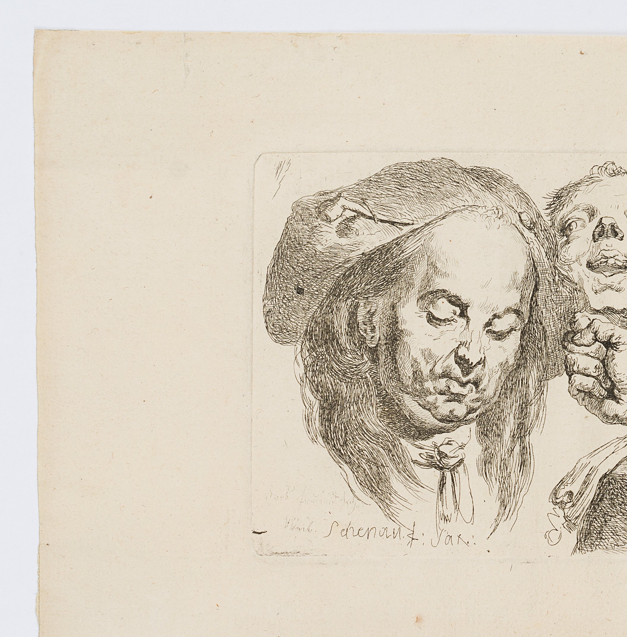 • Description: The sheet belongs to a group of six head studies that Schenau created in 1765 during his time in Paris, in which he explored the possibilities of depicting types, characters, emotions and moods through gestures and facial expressions.