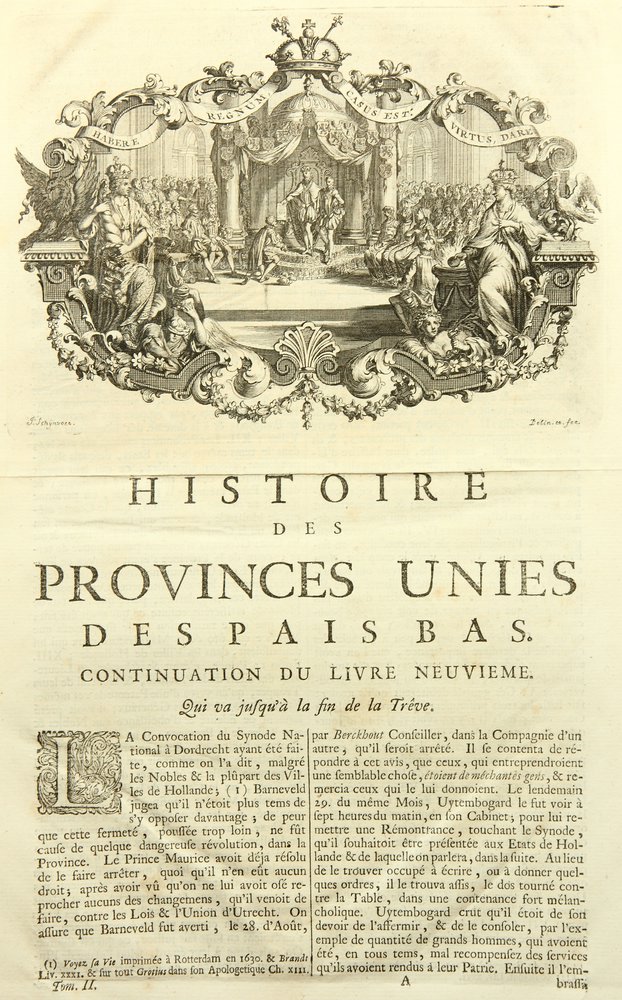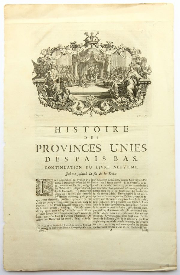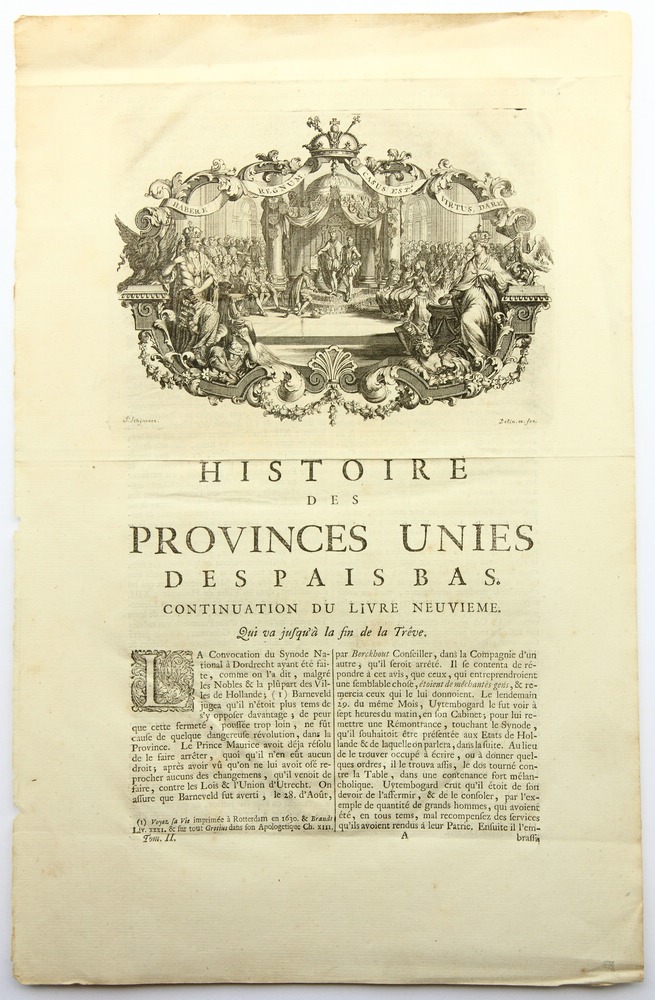 - Bezeichnung: Unterhalb der Darstellung in der Druckplatte vom Künstler signiert. Darunter sowie auf der Blattrückseite befindet sich in typographischem Druck der Ausschnitt aus einem Geschichtswerk. Illustration und Text stammen aus dem Werk Jean Le Clercs: Histoire des Provinces-Unies des Pays Bas. Depuis la naissance de la République jusqu’à la paix d’Utrecht et le traité de la Barrière conclu en 1716. Avec les principales médailles et leur explication, Band 2 aus dem Jahr 1728. Die Seite leitet die Fortsetzung des neunten Buches ein.
