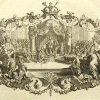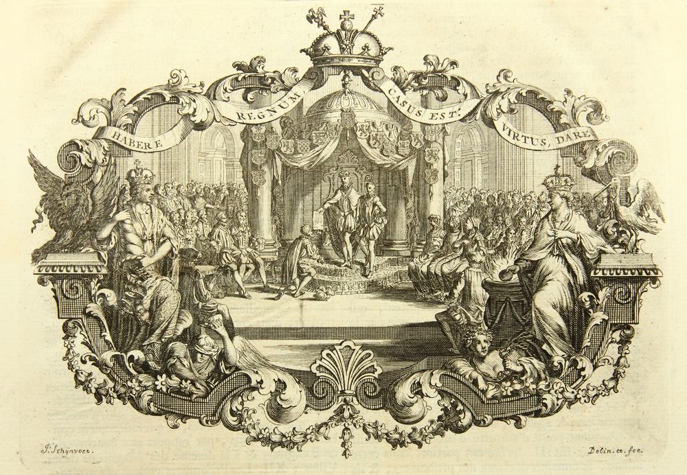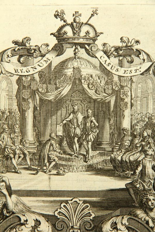 - Description: Depiction of an assembly around the seat of Moritz of Orange(?), who is handing a document to a kneeling man. The depiction is framed by lush ornamental and figural decoration and surmounted by the banner: “Habere Regnum, Casus Est. Virtus, Dare”.