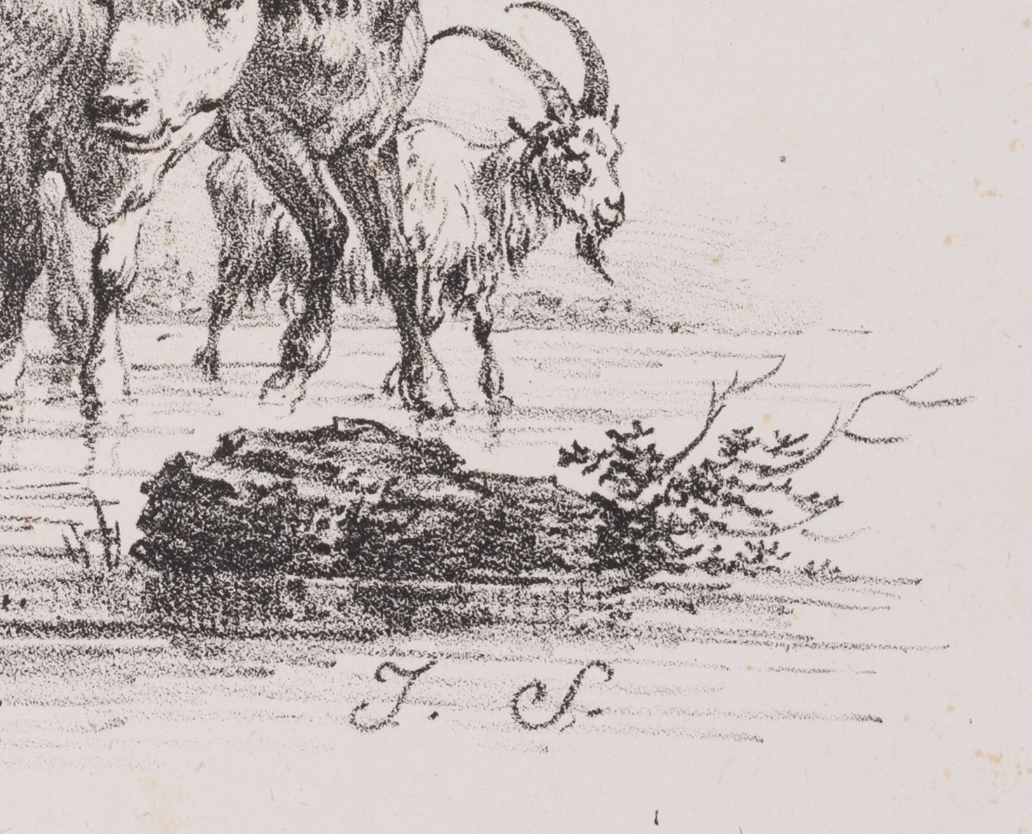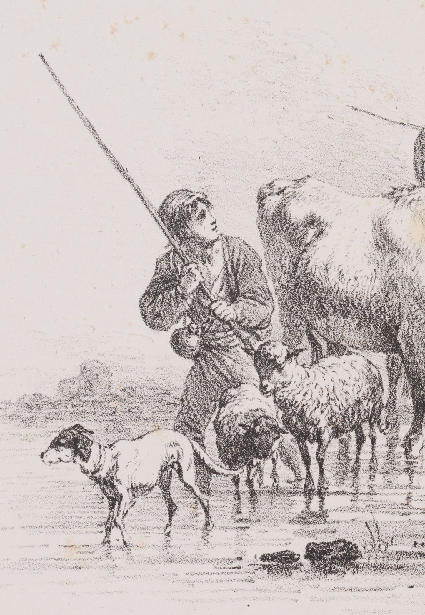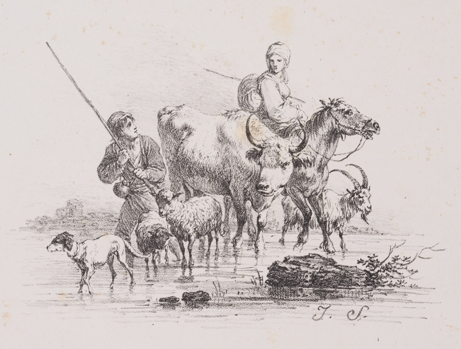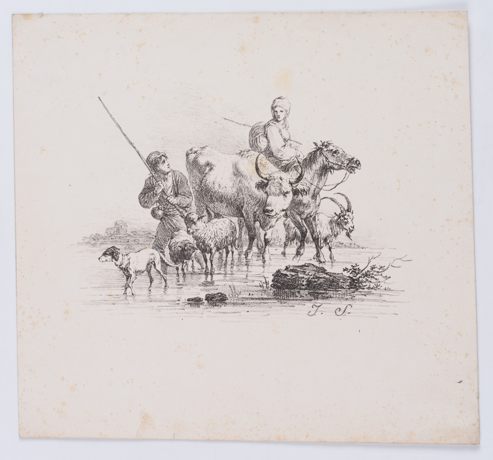 Johann Josef Schindler (1777 St. Pölten – 1836 Vienna), Shepherd boy next to rider in the river, 19th century, Lithography