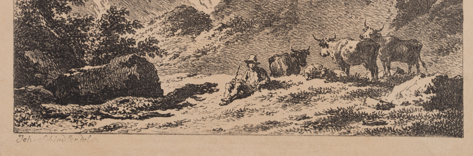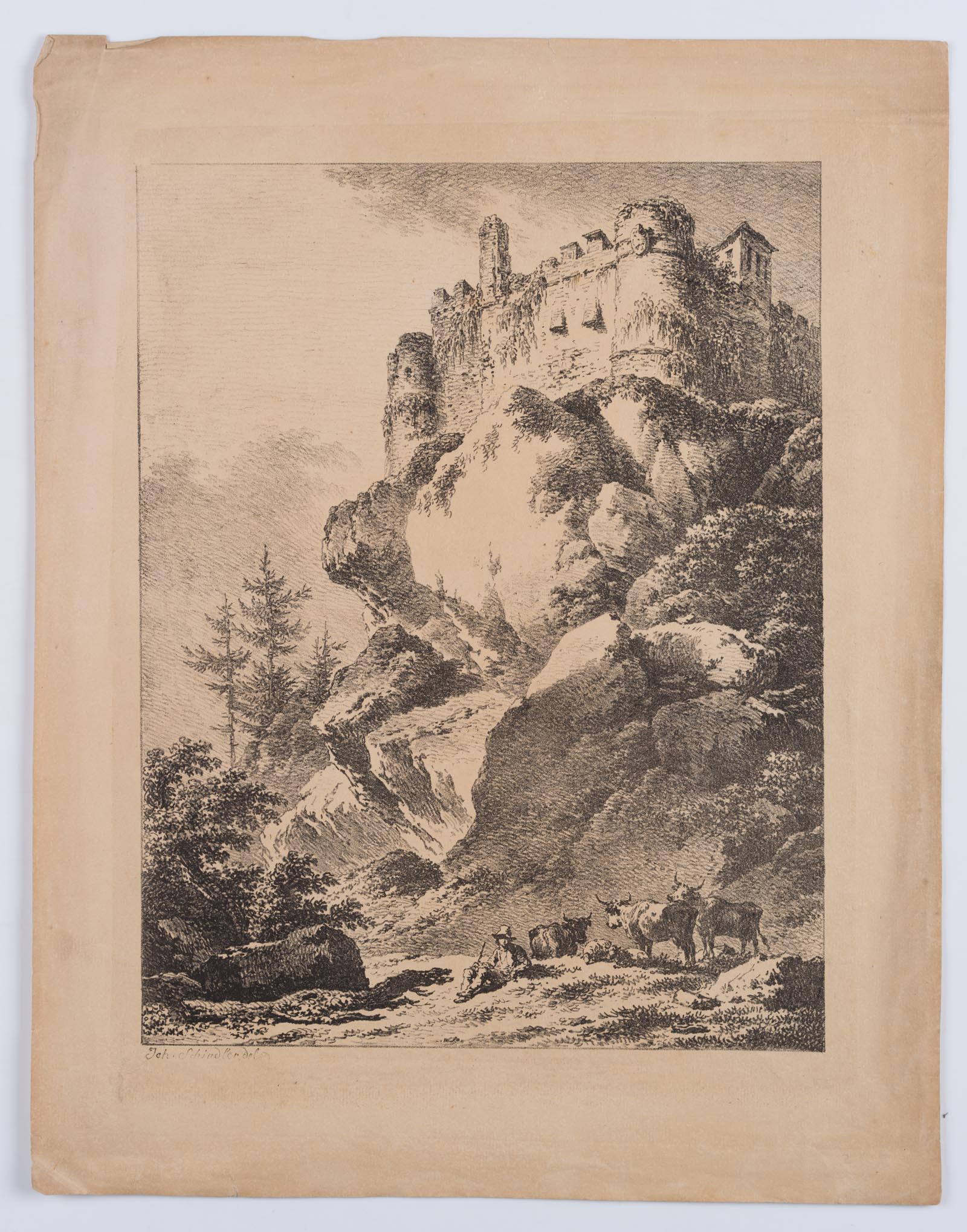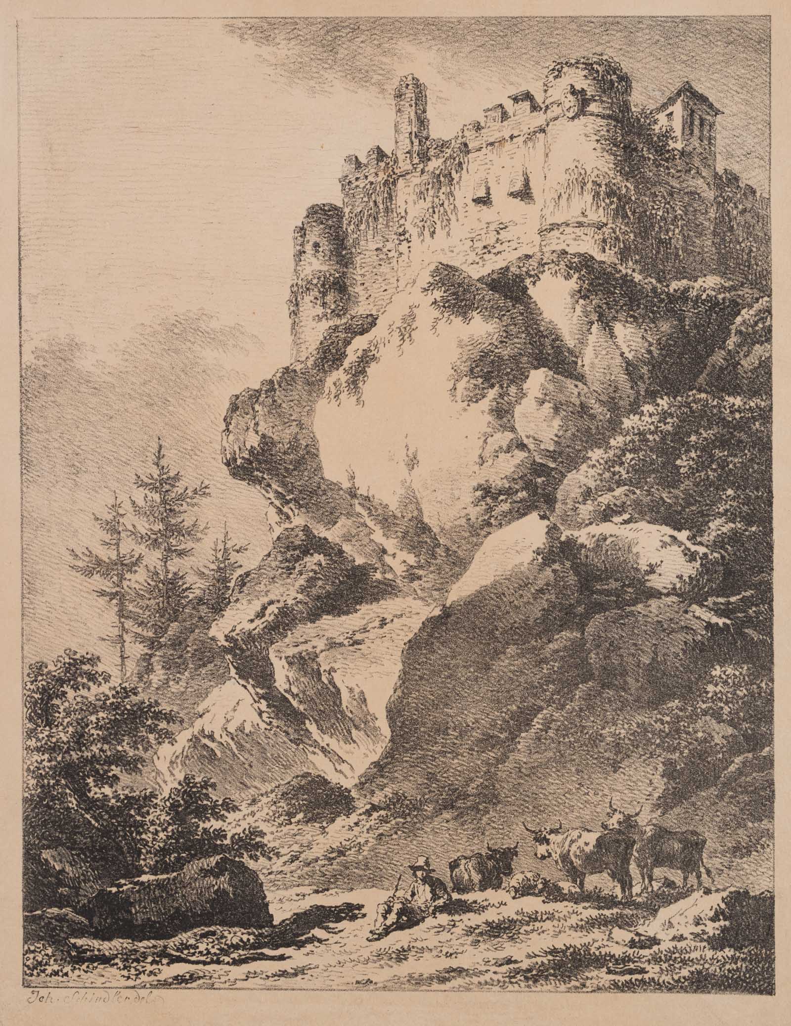 Johann Josef Schindler (1777 St. Pölten – 1836 Wien), Rastender Hirte bei Bergfestung, 19. Jahrhundert, Lithographie