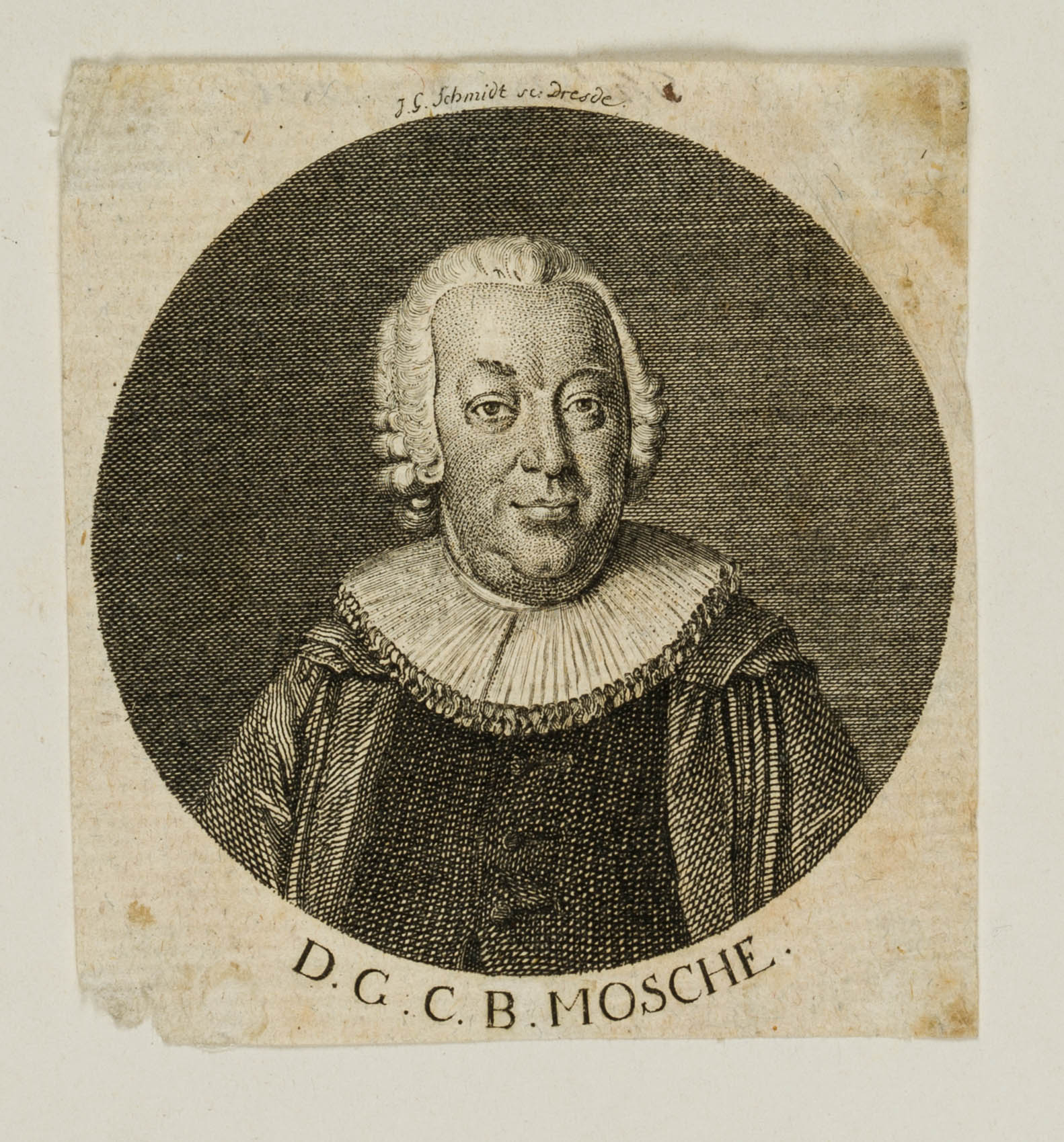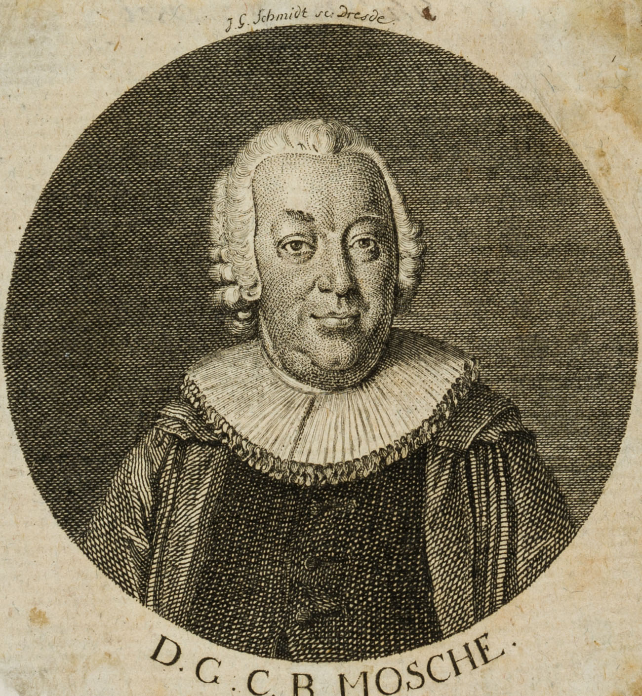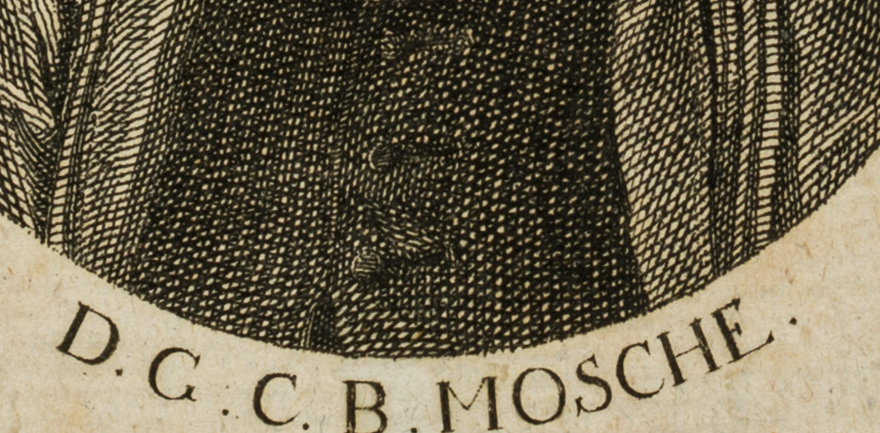Titelkupfer zu: Allgemeines Magazin für Prediger nach den Bedürfnissen unsrer Zeit. Hrsg. von Johann Rudolph Gottlieb Beyer. 2.Band, zweytes Stück – 1789 – Leipzig – bei: Siegfried Lebrecht Crusius; Bildnis des deutschen evangelisch-lutherischen Theologen Mosche (1723 Großenehrlich – 1791 Frankfurt am Main); Überregionales Ansehen erwarb er sich durch die Herausgabe des ‘Bibelfreundes’, einer theologischen Wochenzeitung für Laien. Über der Darstellung signiert: “J. G. Schmidt sc. Dresden”, unterhalb der Darstellung betitelt mit dem Namen des Dargestellten: “D. G. C. B. MOSCHE.”