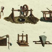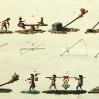 - Description: Probably from the twelve-volume work Friedrich Justin Bertuch: Bilderbuch für Kinder enthaltend eine angenehme Sammlung von Thieren, Pflanzen, Blumen, Früchten, Mineralien, Trachten und allerhand andern unterrichtenden Gegenstände aus dem Reiche der Natur, der Künste und Wissenschaften all nach den besten Originalen gewählt, gestochen, und mit einer kurzen wissenschaftlichen, und den Verstandes-Kräften eines Kindes angemessenen Erklärung begleitet von F. J. Bertuch, Weimar 1792-1830 . Inscribed above the illustration in the printing plate with “Verm. Gegenst. VIII. Melanges VIII. Miscell. Subj. VIII. Miscellanea VIII. The principles of the law of the lever, the pulley and the inclined plane are illustrated in miniature representations.