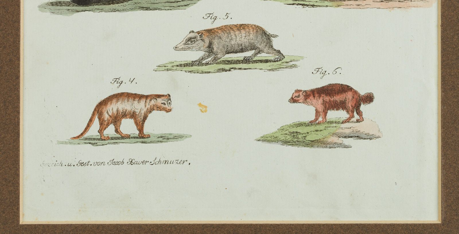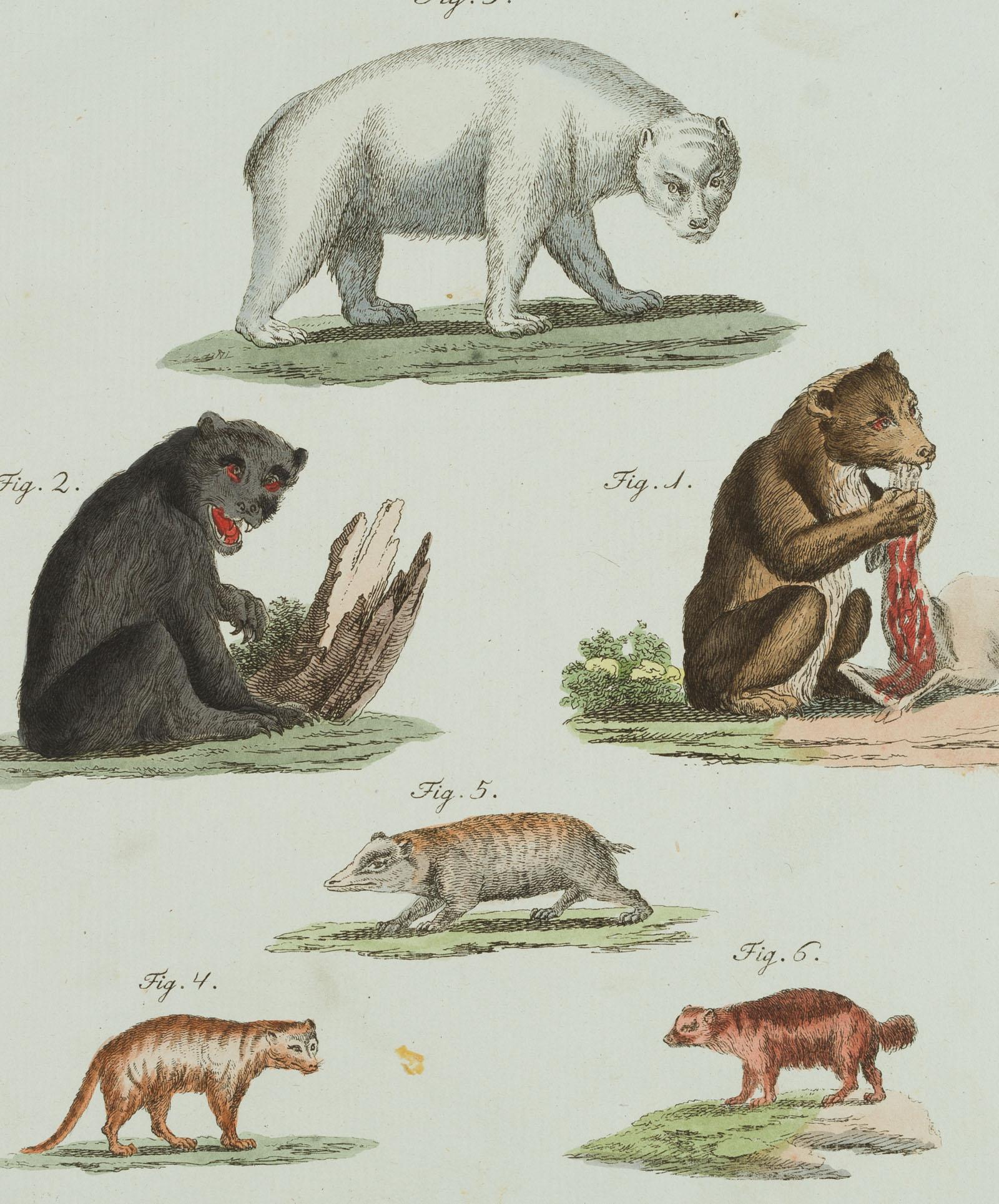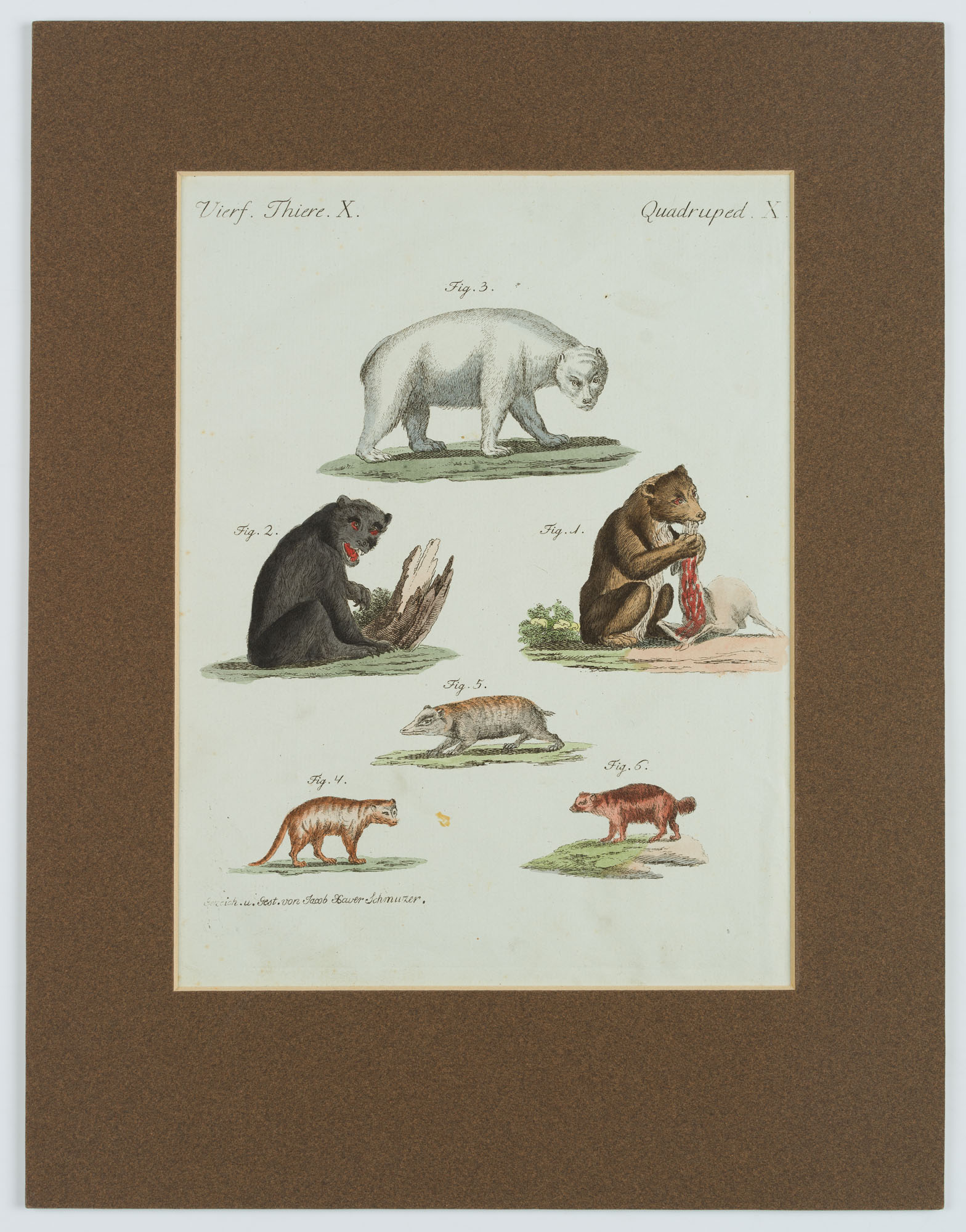 Mit 6 verschiedenen Bären-Arten, darunter der : ‘Land-Bär’, ‘Eis-Bär’, ‘Schupp’. ‘Dachs’ und ‘Vielfrahs’. Vermutlich aus dem zwölfbändigen Werk ‘Bilderbuch für Kinder’. Die von Friedrich Justin Bertuch herausgegebene Publikation war ein für Kinder enzyklopädisch angelegtes Sach- und Lehrbuch der Weimarer Klassik. Es beinhaltete Tiere, Pflanzen, Blumen, Früchte, Mineralien, Trachten und andere Gegenstände aus dem Reiche der Natur, der Künste und Wissenschaften. Oberhalb der Darstellung in der Druckplatte bezeichnet mit “Vierf. Thiere. X. | Quadruped. X.”, unterhalb der Darstellung in der Druckplatte signiert. Die Tiere sind jeweils nummeriert. Zu dem illustrierten Blatt gehört ein erklärendes Blatt, das in kurzen Texten die Abbildungen kommentiert. Die Erklärungen sind jeweils auf einer Seite und umfassen die Sprachen Deutsch und Französisch.