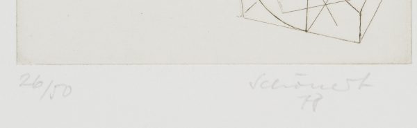 - Description: Signed and dated below the image “26/50 Schönert 78”. From the hand of the Städel student (1959-64) Johannes Schönert; Schönert was influenced here in Frankfurt/M by the important artist and art professor Hans Mettel; 1964 travel scholarship to Greece; 1985 guest lecturer at the Hochschule für Gestaltung Offenbach; since 1965 international exhibitions. Works in public possession (selection): Oberhessisches Museum Gießen,Universitätsmuseum für Bildende Kunst, Marburg, Staatl. Kunstsammlungen Dresden, Kupferstichkabinett and the Staatliche Kunstsammlungen Kassel. About his own art he says: “My work does not repeat an idea, but tries to make an experience that is still unknown.” Although his work developed more and more in the direction of abstract representation, the basis and idea of his works nevertheless remains nature, the beautiful and dangerous forces of the earth.