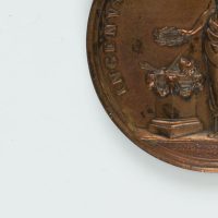 - Description: Finely worked bronze relief in medal form. Showing a female allegory, wearing a tiara and key as attributes of the pope and placing a laurel wreath on an altar.
