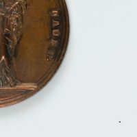 - Beschreibung: Fein gearbeitetes Bronzerelief in Medaillenform. Zeigt eine weibliche Allegorie, Tiara und Schlüssel als Attribute des Papstes tragend und einen Lorbeerkranz auf einen Altar legend.