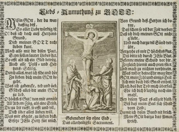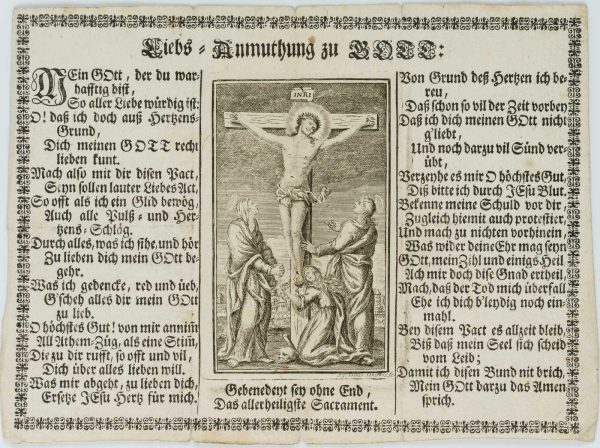 - Condition: Very good condition. Foxing and pale brown discolouration in the area of the image. Three vertical creases, as the sheet was intended as an insert in a prayer or hymn book. One visible horizontal crease also in the area of the illustration. Edges slightly bumped and torn, bottom right corner creased.