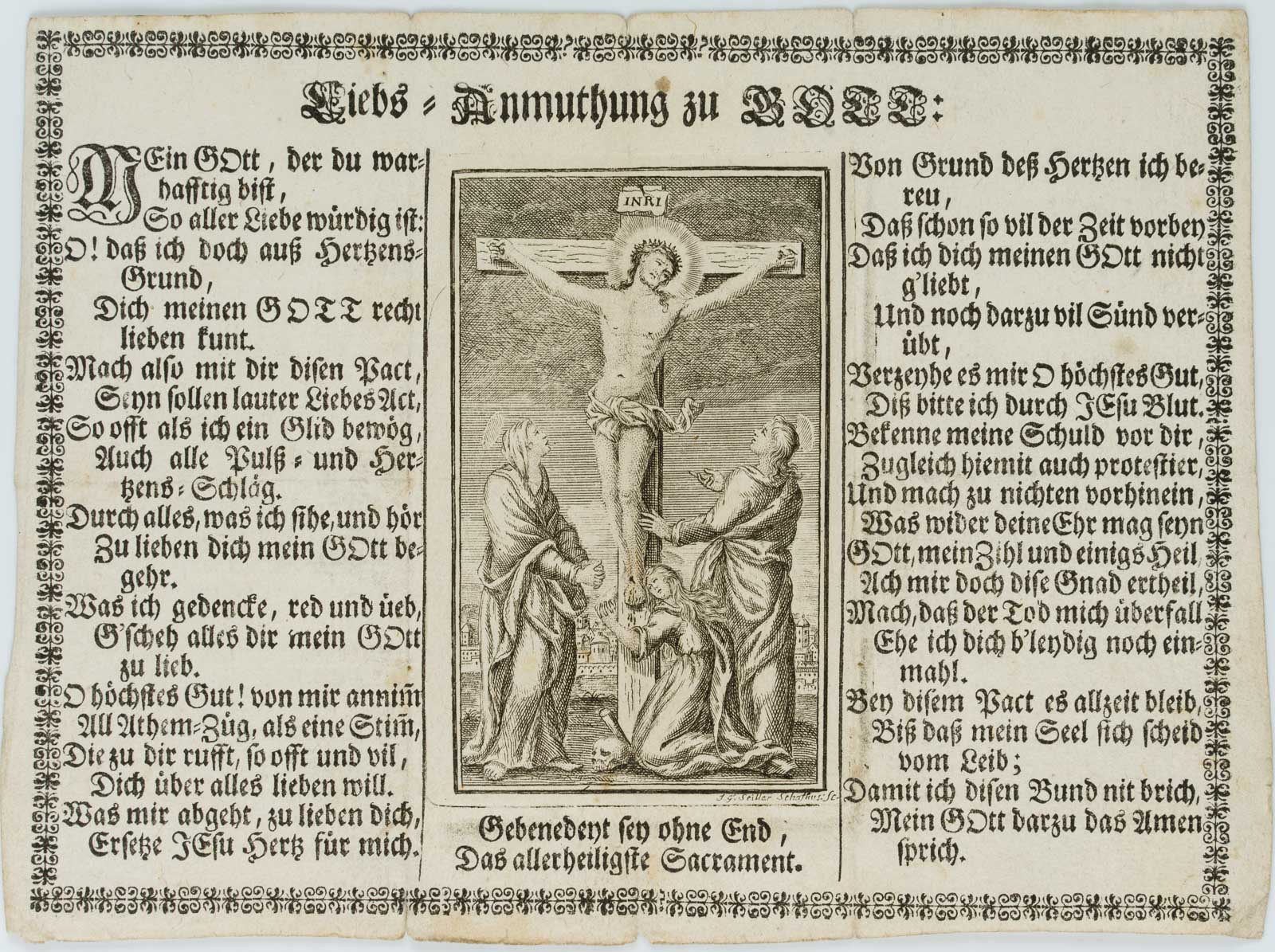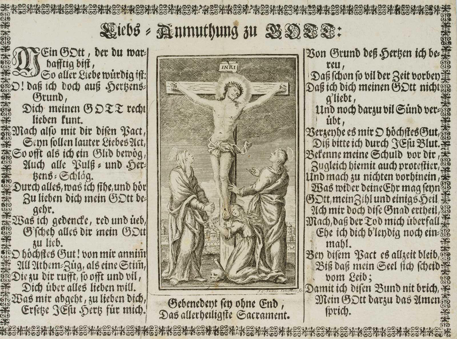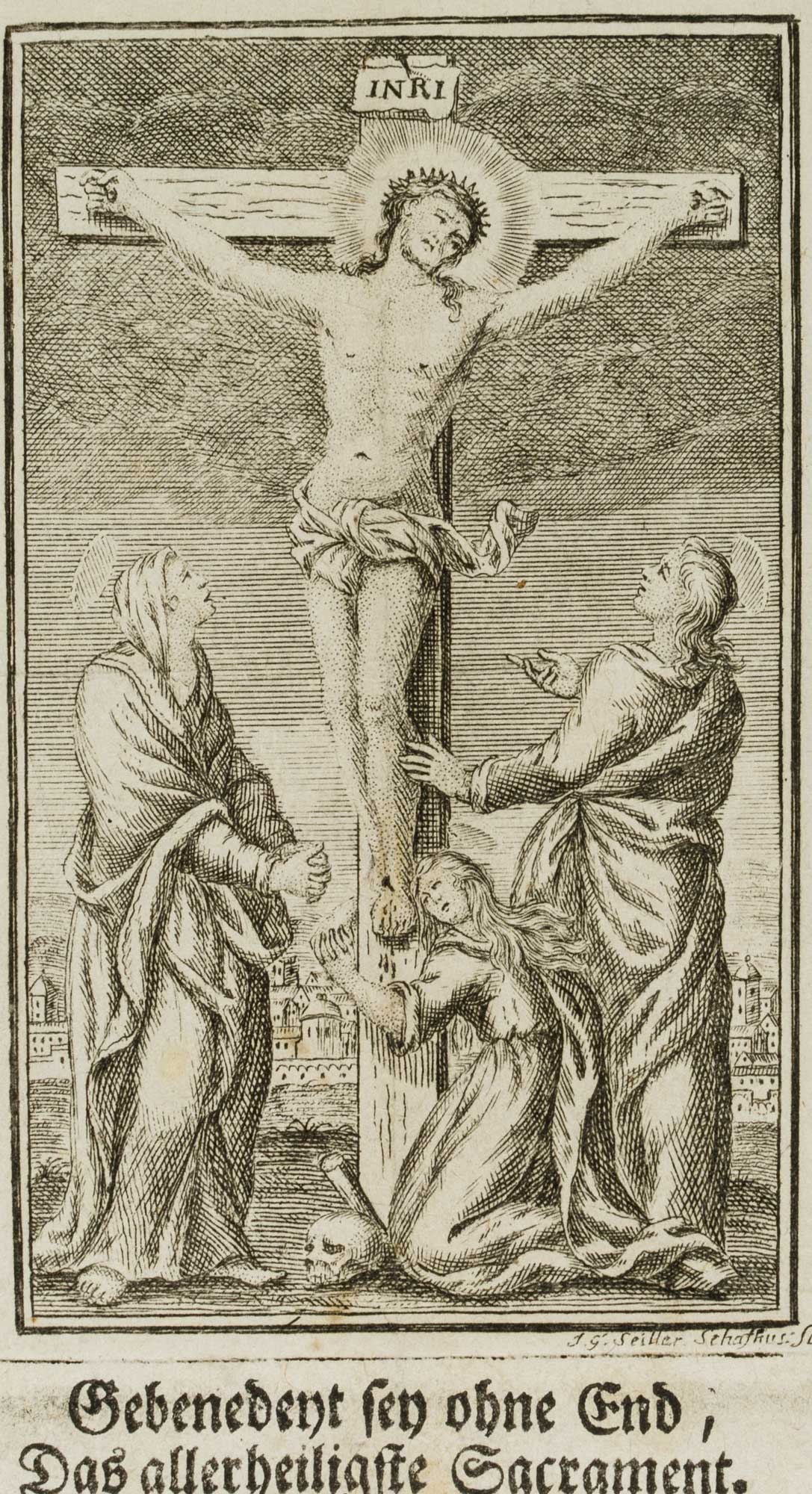 - Description: Commendation card intended as an insert in a hymnal or prayer book. The central vignette shows the crucifixion group with Mary Magdalene at the foot of the cross and the skull of Adam. The typographic print is framed by a decorative vignette. Signed “J.G. Seiller Schaffhausen” in the printing plate below the image.