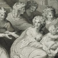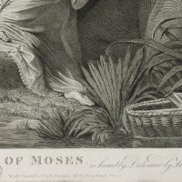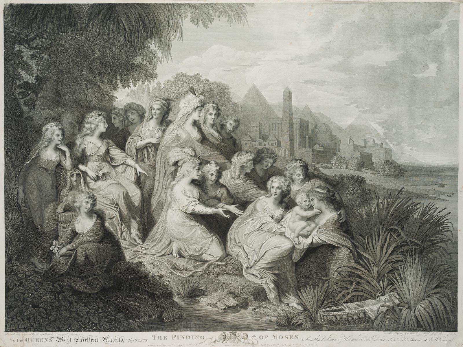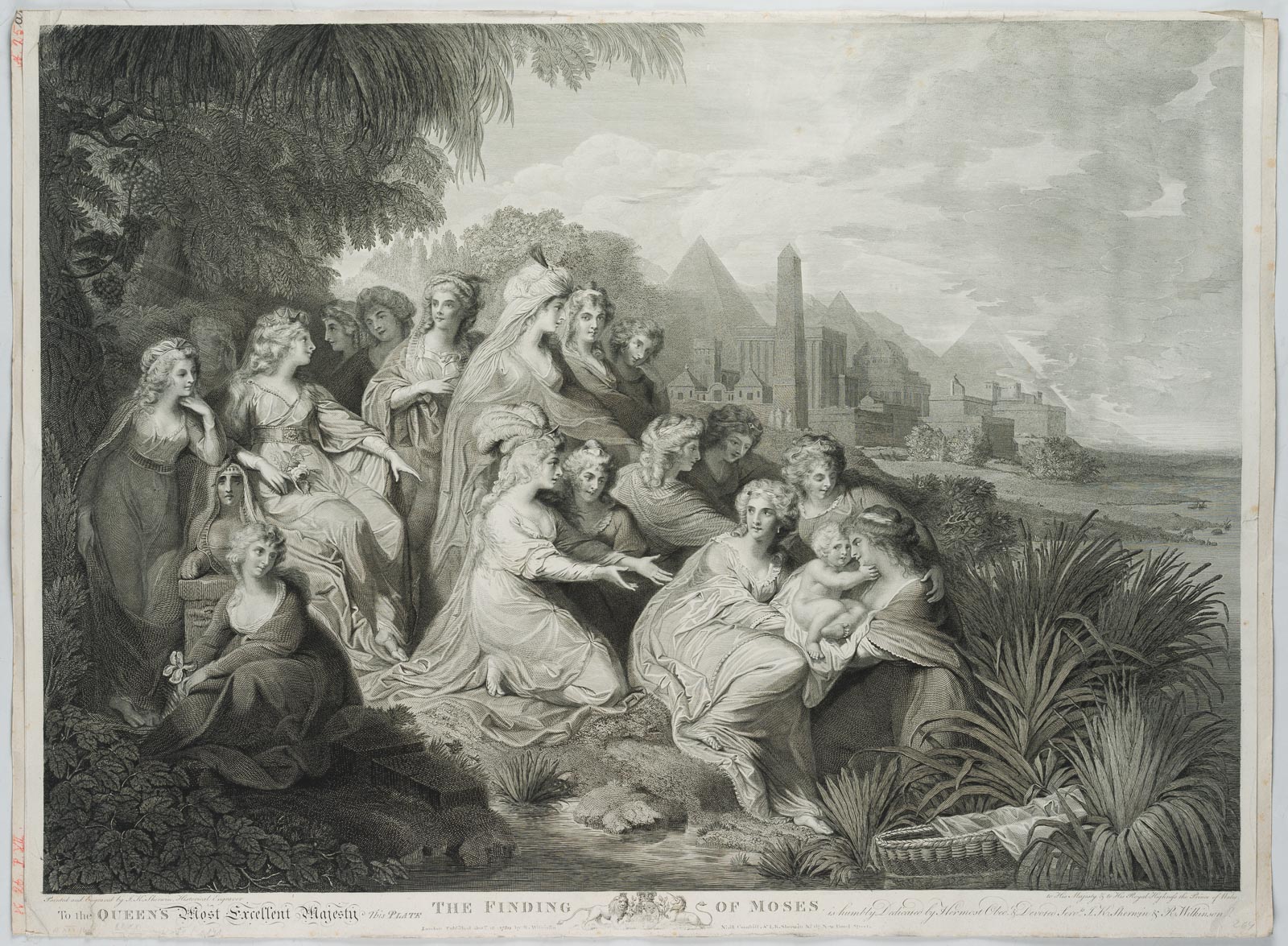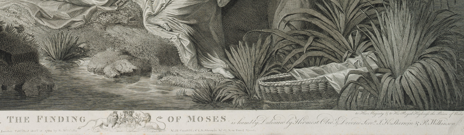 Under the depiction with the title “The Finding Of Moses” flanking the royal coat of arms and name: ‘Painted and Engraved by J. K. Sherwin Historical Engraver / to his Majesty & to His Royal Highness the Prince of Wales / London. Published Jany. 18 1789 by R. Wilkinson No.58 Cornhill & I. K. Sherwin No.67 New Bond Street’ and dedication line “To the Queen’s Most Excellent Majesty this plate is humbly dedicated by her most obedient & devoted Serv. Shervin & Wilkinson”. - Keywords: 18th century, Figurative, Landscape, United Kingdom,