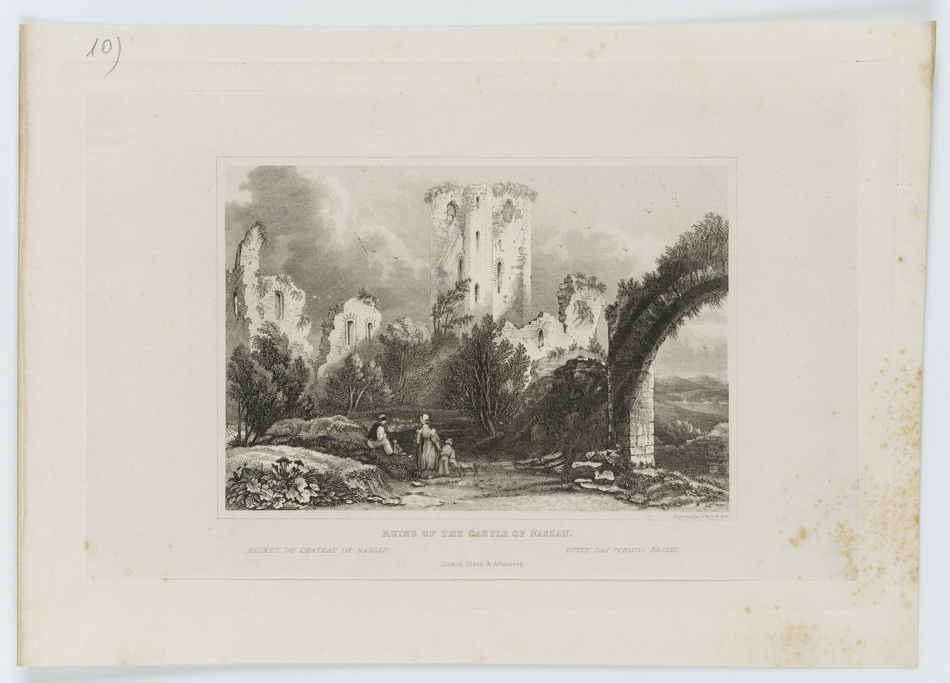 - Bezeichnung: Unten signiert und betitelt: “Ruins of the Castle of Nassau. Ruines du chateau de Nassau. Ruine das Schloss Nassau.”