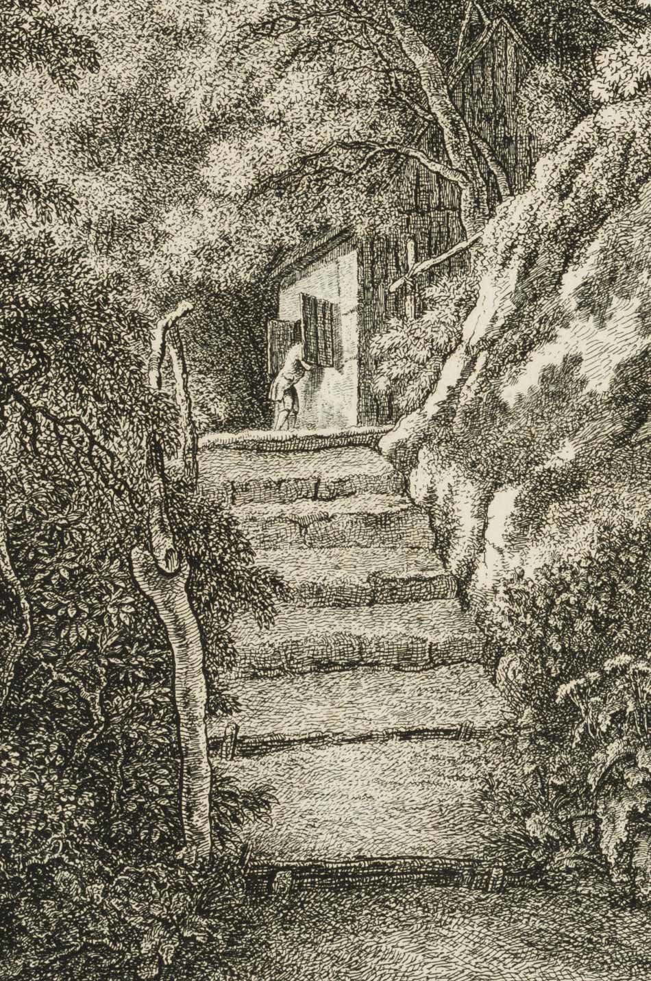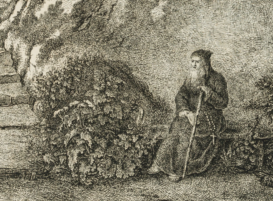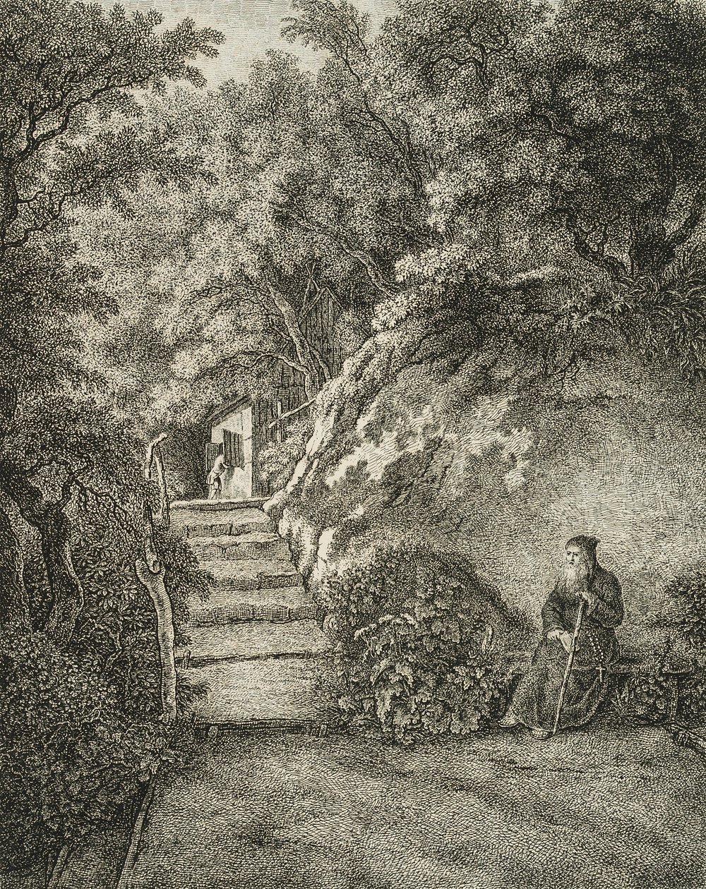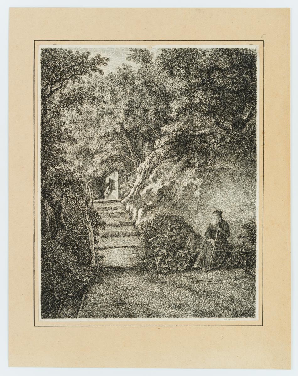 Die Radierung zeichnet sich durch eine kleinteilige Strichführung aus, die durch unzählige, oft kurze, Striche ein dichtes Liniennetz bildet. Diese Handhabung äussert sich besonders anschaulich in der kleinteiligen Strukturierung der Pflanzen und dem Laub der Bäume. Auch die Stofflichkeit des Lehmboden und der Kleidung des frommen Einsiedlers wird dadurch greifbar und plastisch. - Schlagworte: Mönch, Eremit, Einsiedelei, Eremitage, Religiös, Personen, Deutschland, Romantik, 1800-1849