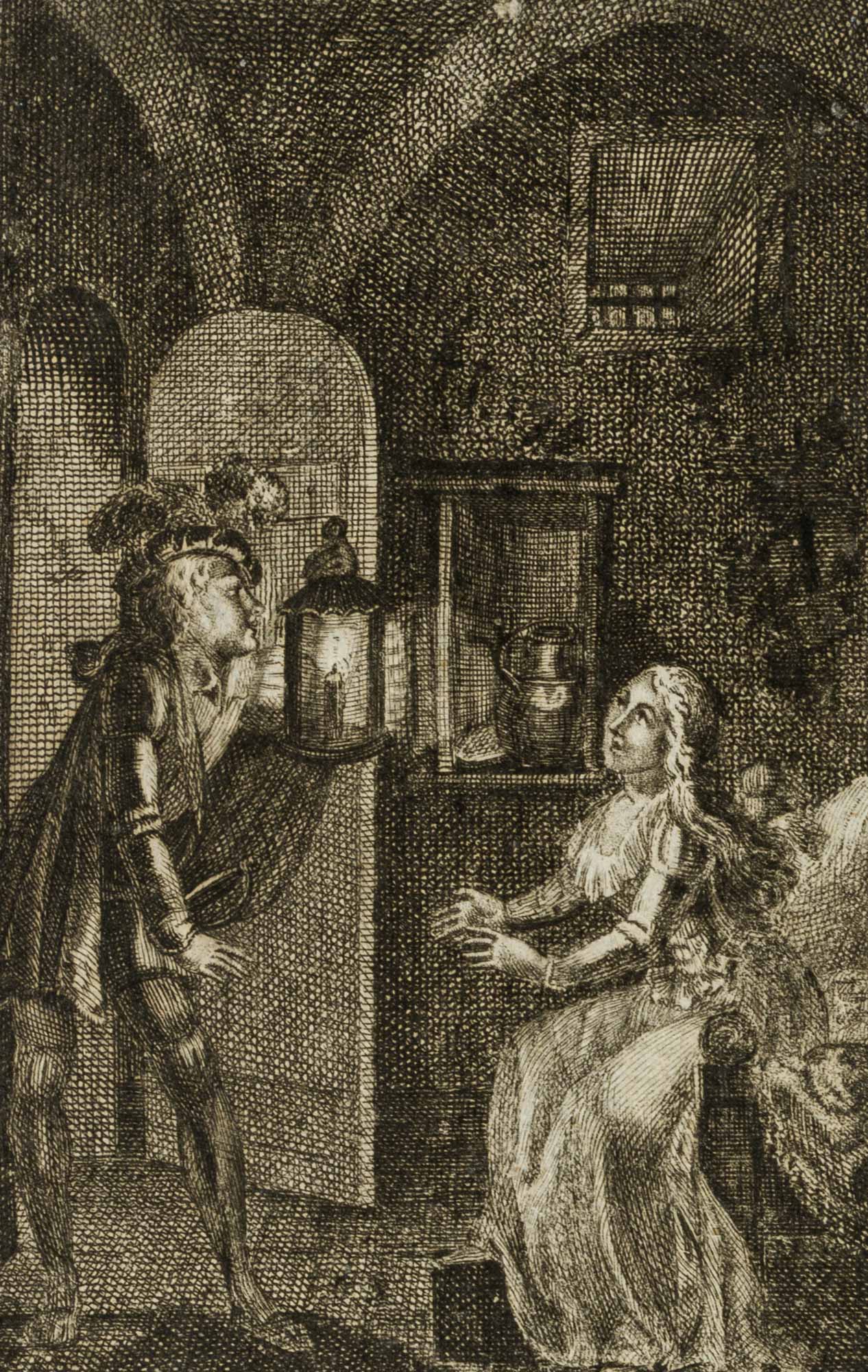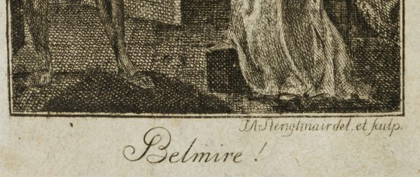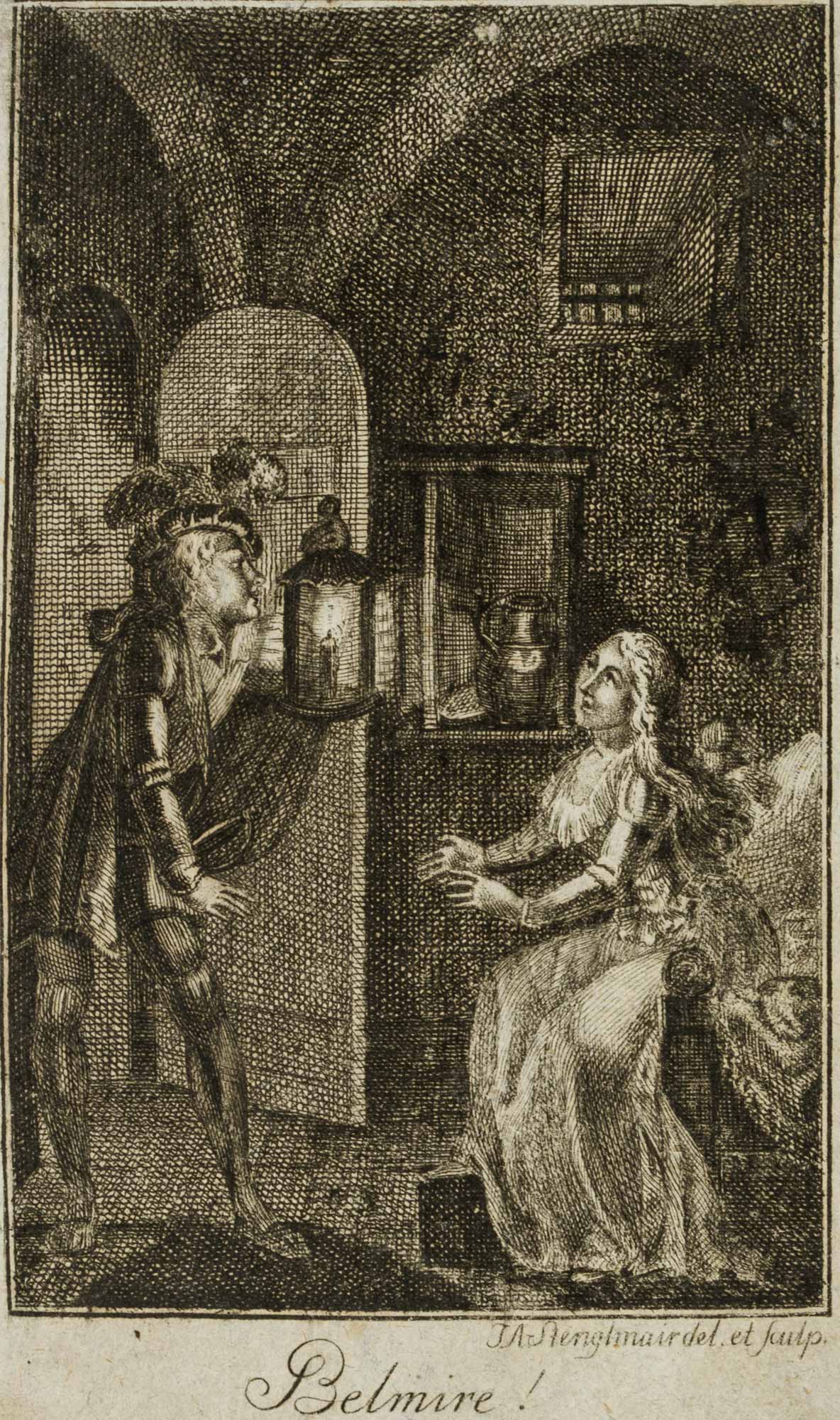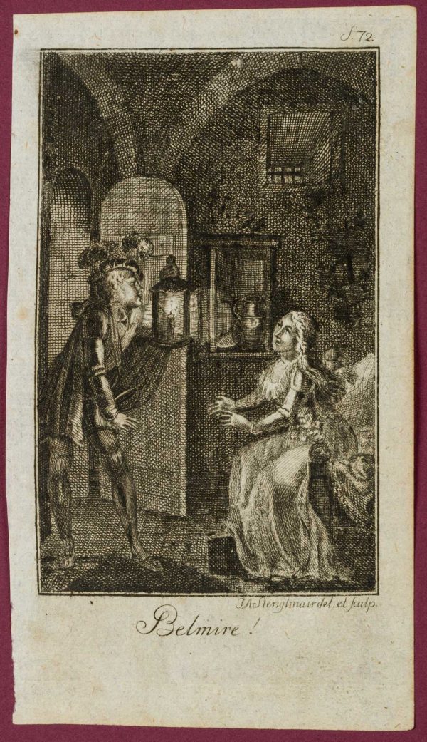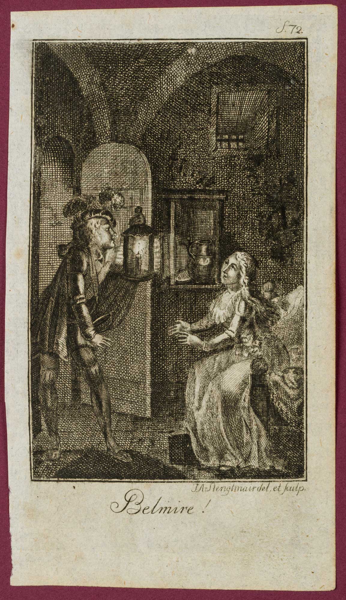 - Description: A young man with a lantern in his hand enters the chamber of his beloved, who seems to await him joyfully. The print bears the caption: “Belmire”.