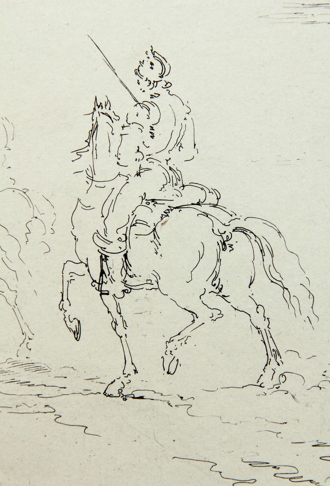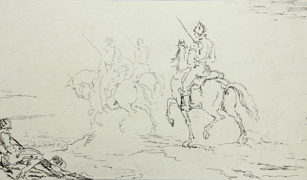 - Description: Masterly depiction that creates an impressive atmosphere by means of abstract and dynamic lines. Full-length depiction of three riders in back view in a barren landscape. A figure crouches on the ground at the lower left.