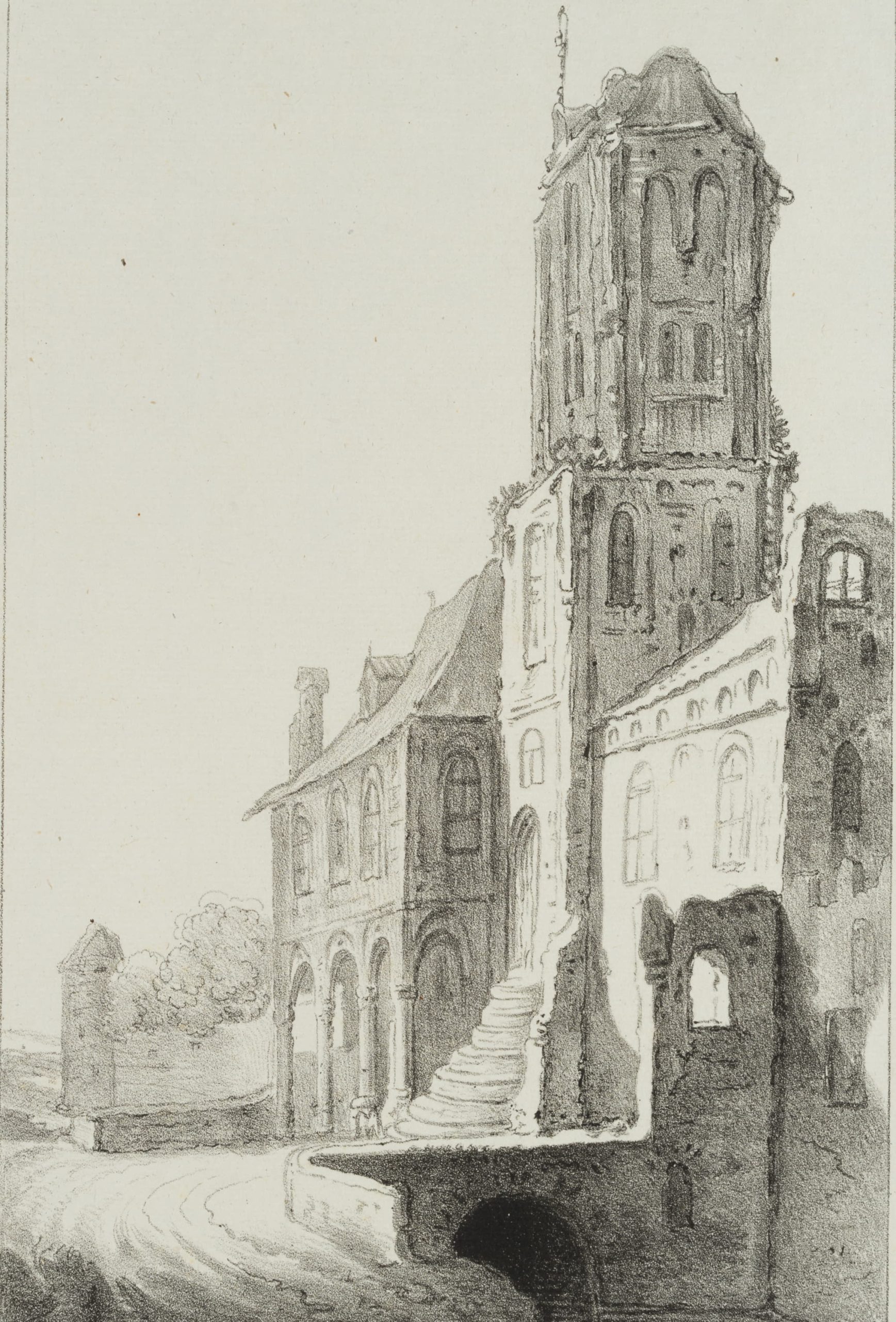 Johann Nepomuk Franz Xaver Strixner (1782 Altötting – 1855 München), Alter Kirchturm mit steiler Treppe, 19. Jahrhundert, Lithographie