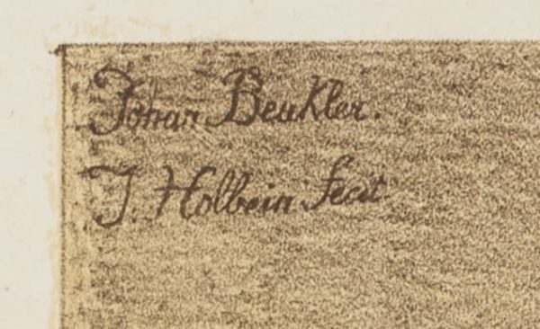- Bezeichnung: oben links und rechts im Stein bezeichnet und signiert: “Johan Beukler. J. Holbein fecit | N. Strixner del.”