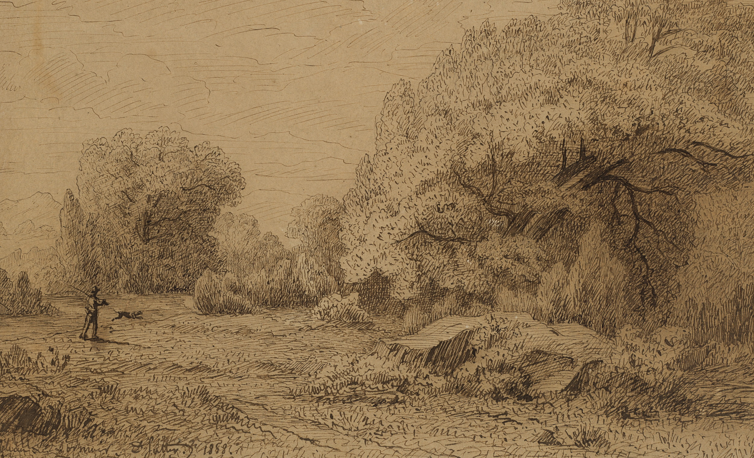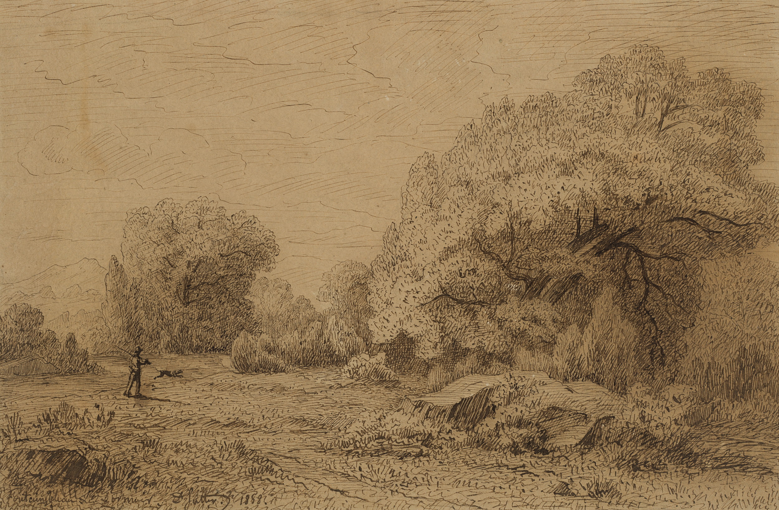 Jean David Sutter (1811 – 1880 ), Fontainenbleau woodland with hiker, 1888, Indian ink