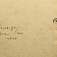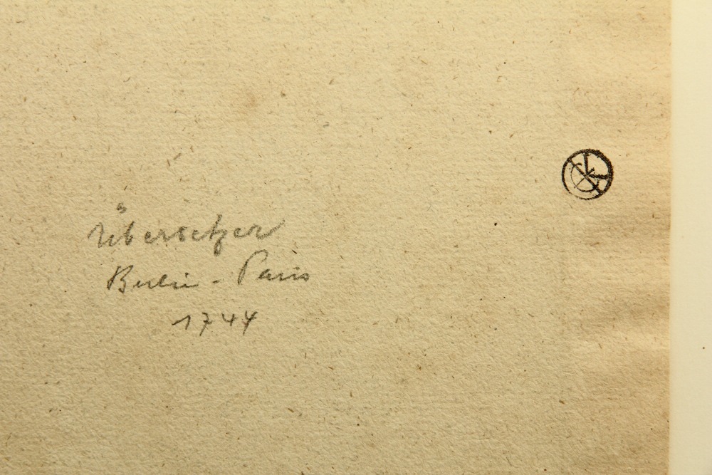 - Bezeichnung: Unterhalb der Darstellung in der Druckplatte vom Künstler signiert. Rückseitig befindet sich auf dem Trägerblatt ein Sammlungsstempel mit dem Monogramm „EK“.