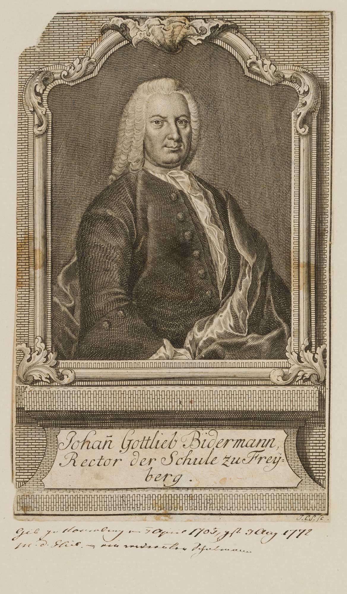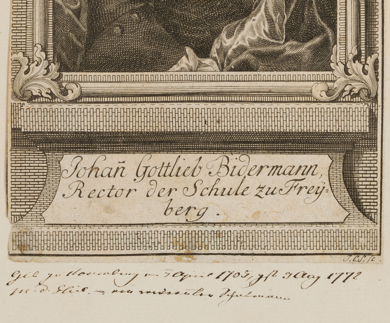 - Bezeichnung: Unterhalb des Portraits mit dem Namen des Dargestellten beschriftet, rechts darunter monogrammiert mit “JCS sc”. Das Blatt stammt aus der Sammlung Rosenthal – München/Hilversum