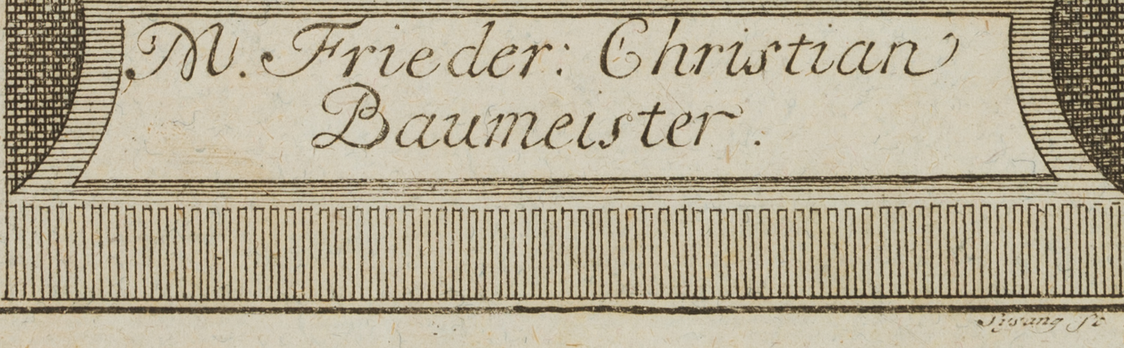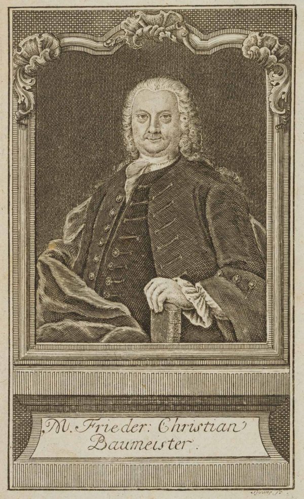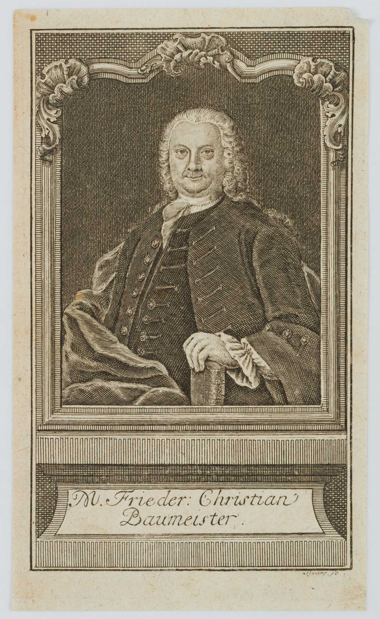 - Description: Half-length portrait of Friedrich Christian Baumeister, German philosopher and pedagogue, pupil in Gotha; from 1727 student in Jena and Wittenberg, 1730 Mag. phil.; 1736 school rector in Go?rlitz. The left hand resting on a book, in front of a dark background in a rectangular frame with scrollwork at the upper margin. Under the picture field a plinth area with inscription plate, on it the name of the sitter.signed “Sysang sc.” on the right below the depiction.