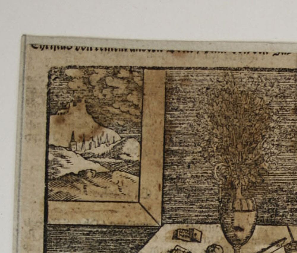 • Description: Woodcut by Johann Teufel, bottom left of the image dating above a key: “1558”. John the Evangelist sits on a chair and writes in a large folio, which the angel holds for him. On the table in front of him is a large vase of flowers, and below it, as in a still life, are various objects: a book, a letter, and an inkwell with a quill. Johann Teufel was a German form cutter. He was demonstrably active in Wittenberg around 1564-1584.