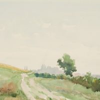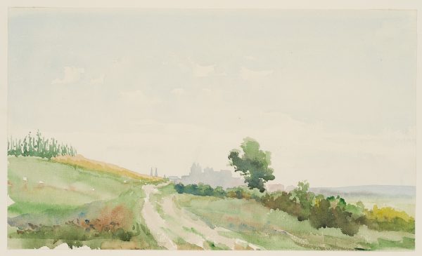 - Description: Landscape study on a country lane on a hill with a view of the silhouette of a town. The double tower and compact building mass could point to Bregenz. Thaeter was born in nearby Lindau.