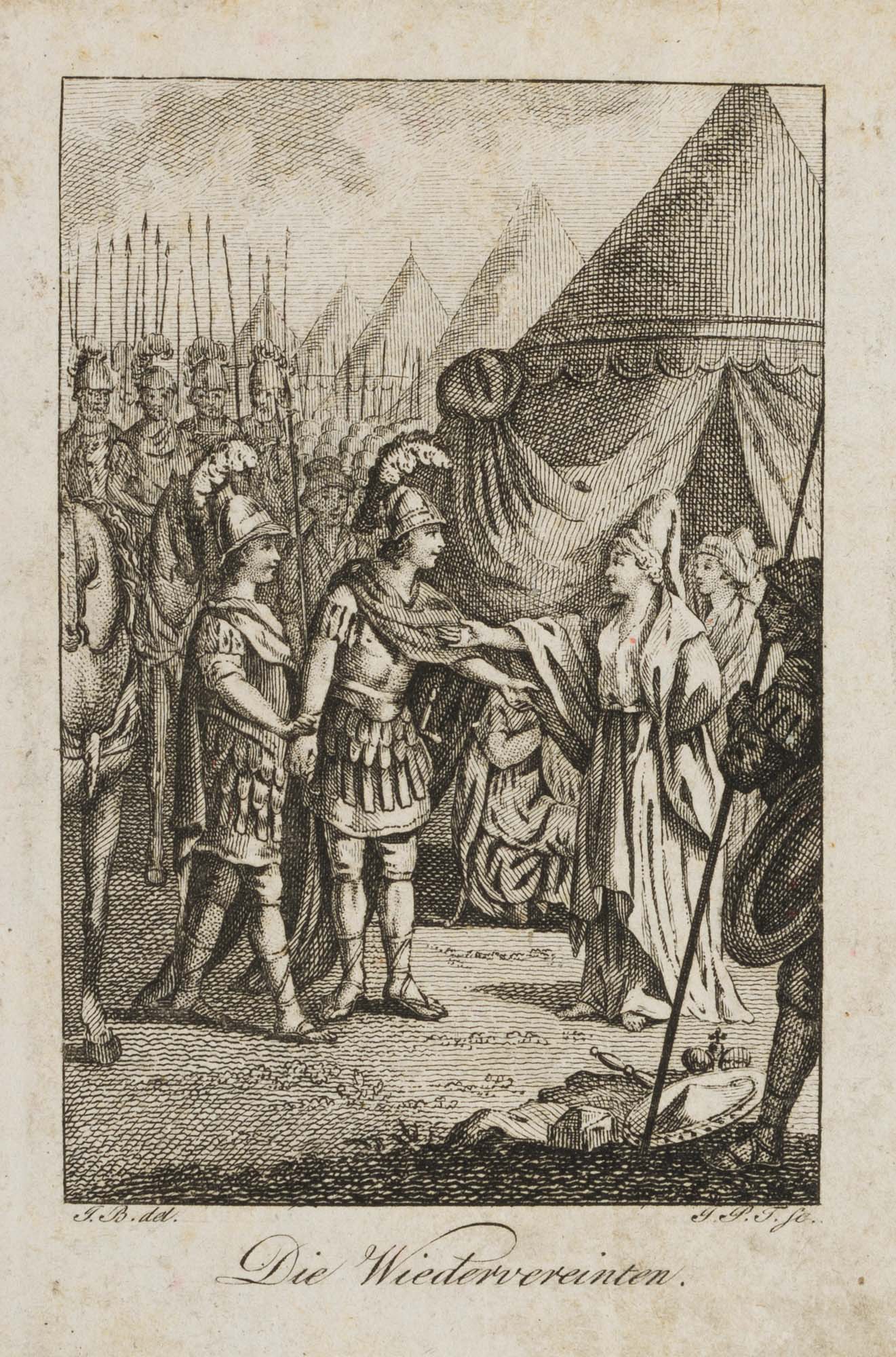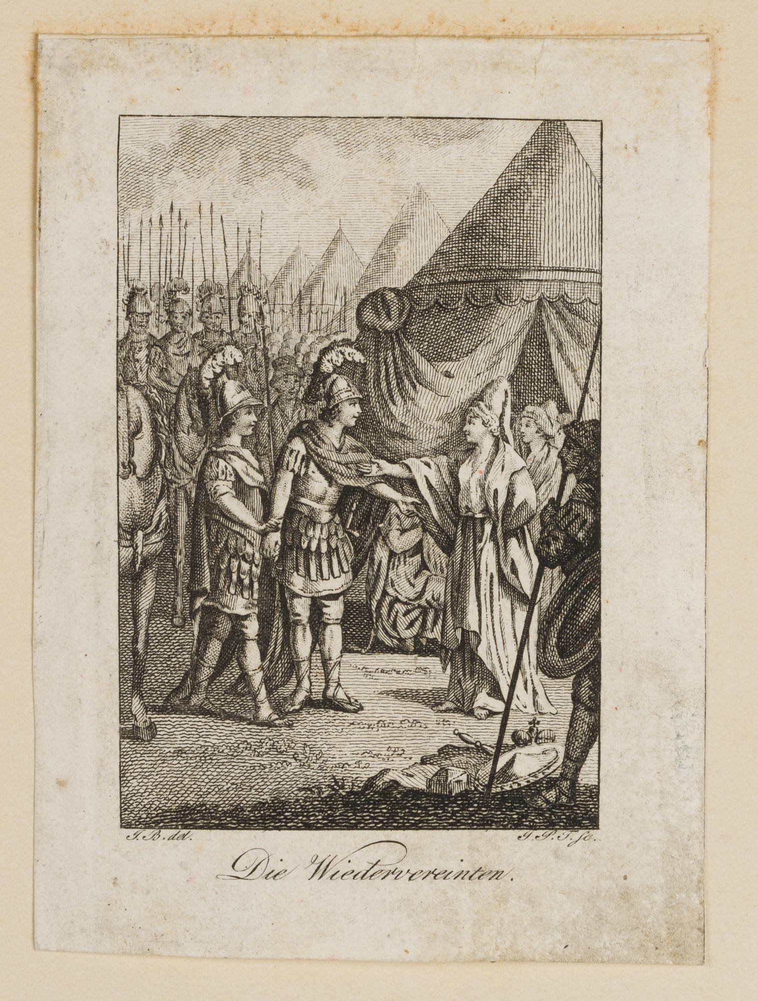 Unter der Darstellung signiert “J.B. del. / J. G. T. sc.”. Mittig Bildunterschrift: “Die Wiedervereinten.”Aus dem Nachlass des Antiquars Rosenthal München / Amsterdam.