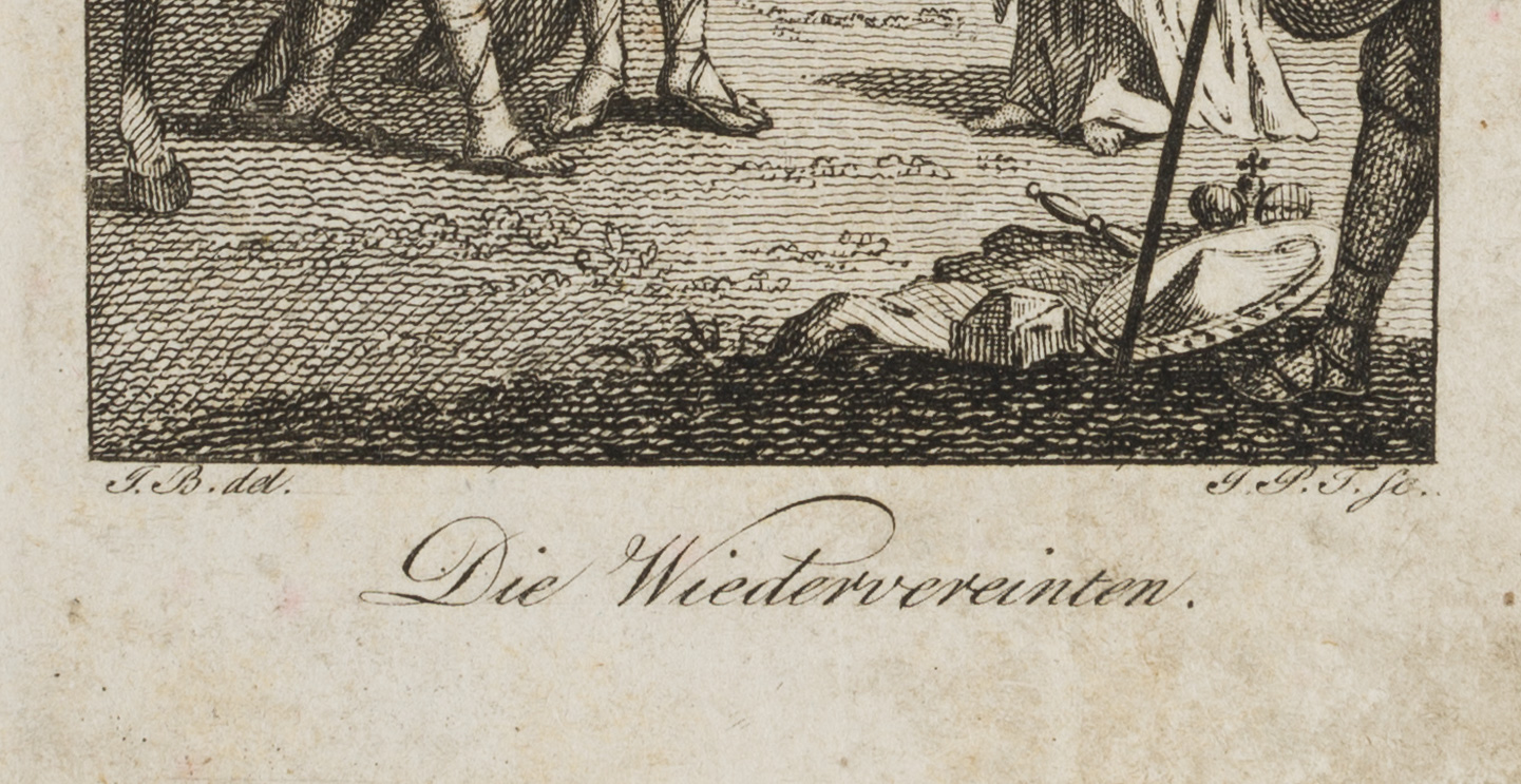 • Description: Signed “J.B. del. / J. G. T. sc.” below the image. Centre caption: “Die Wiedervereinten.”