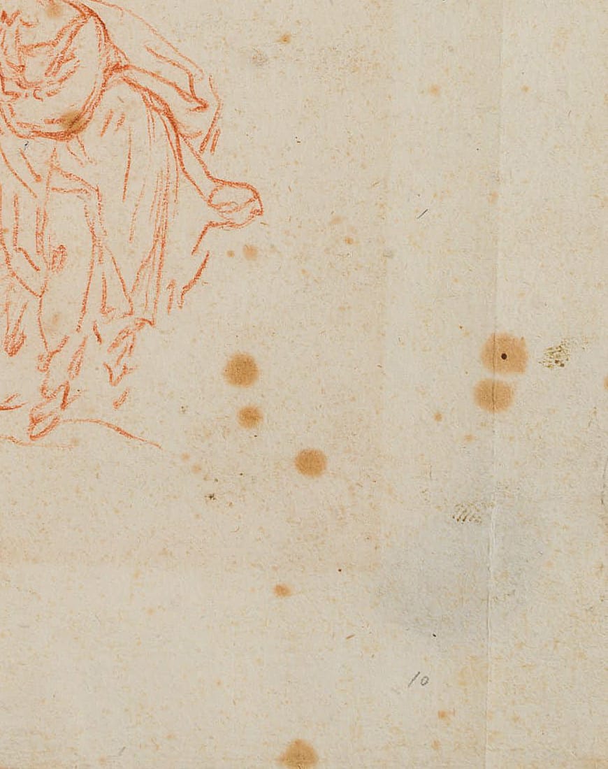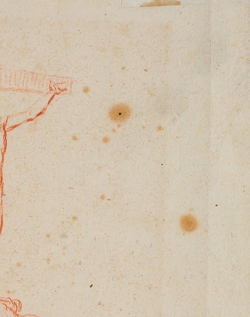 - Zustand: Akzeptabler Zustand. Vertikale Knickfalte rechts, fleckig und gebräunt, Lichtrand. Reste alter Montierung verso und recto.
