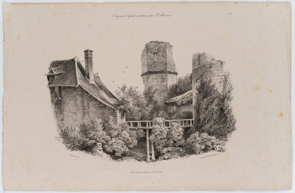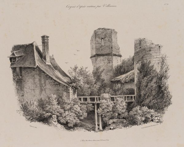 - Description: Historical view of a village. Lithograph, 1833, picturesque view of the ruins of a castle. Listed with Nagler XXIII. Titled “Croquis d’apres nature par F. Villeneuve” above the image and numbered “No.36” at upper right, signed, dated and inscribed “F. Villeneuve 1833 / a Paris, chez Bance Editeur rue St. Denis, No. 214 /Litho de Benard et Bichebois ainé.” below the image. With blind stamp “BBT”.