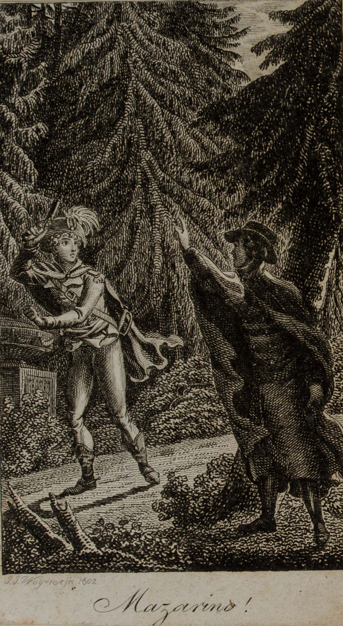 J. J. Wagner (19. Jahrhundert), Figurenszene im Wald, “Mazarino!”, Sammlung Hasselmann, 1802, Radierung