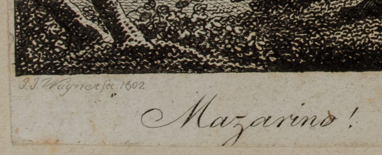 - Description: Miniature and illustration of contemporary literature. Signed and dated on the lower plate: “J.J. Wagner fec.” and titled “Mazarino! The print comes from the collection of the Munich architect Fritz Hasselmann (1867-1925), with blue collector’s mark “F.H.” on verso, Lugt number L.1012. From the famous house “Ludwig Rosenthal’s Antiquariat”, Munich.