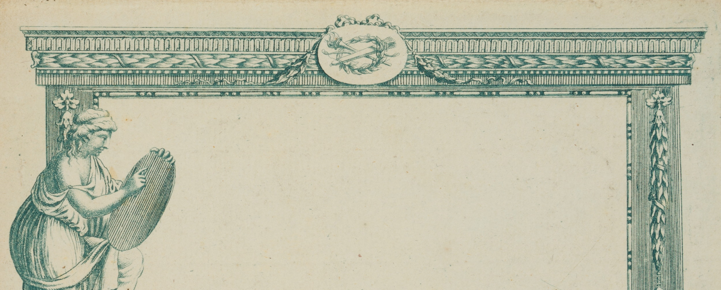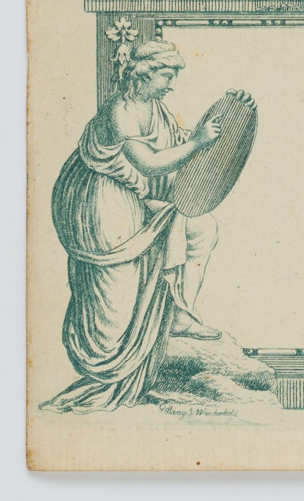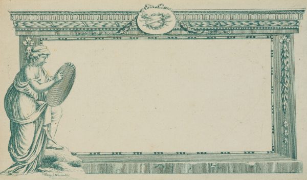 • Beschreibung: Schmuckvolle Rahmung im klassizistischem Stil mit Zupfinstrument spielender Allegorie.