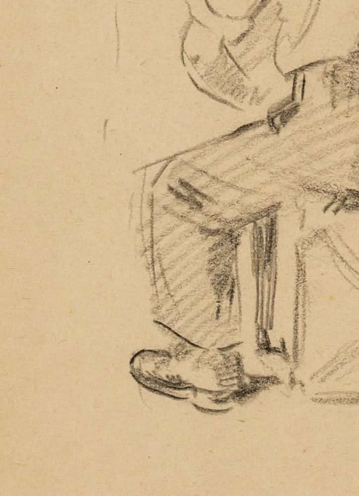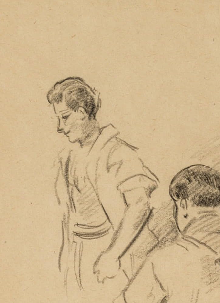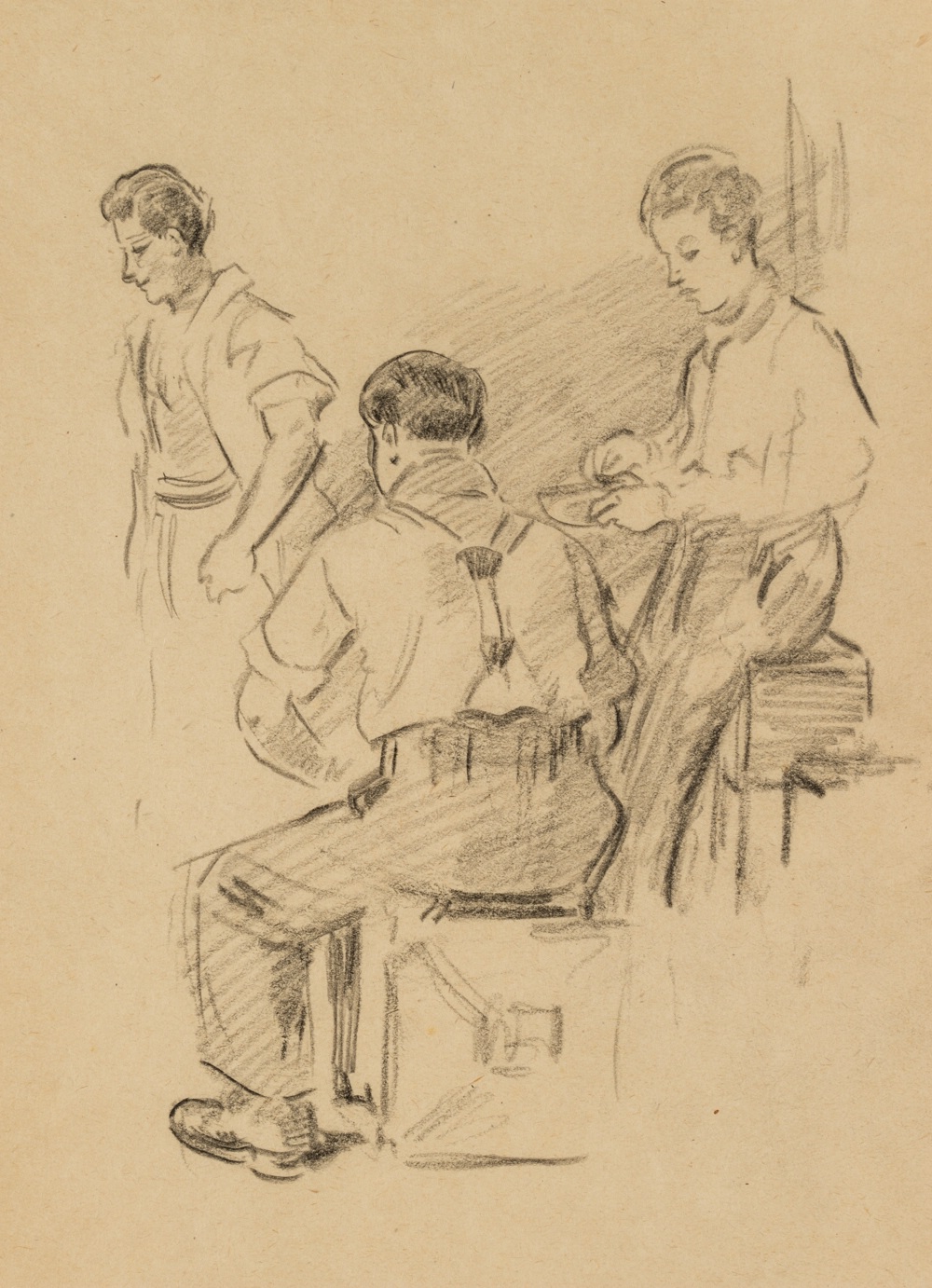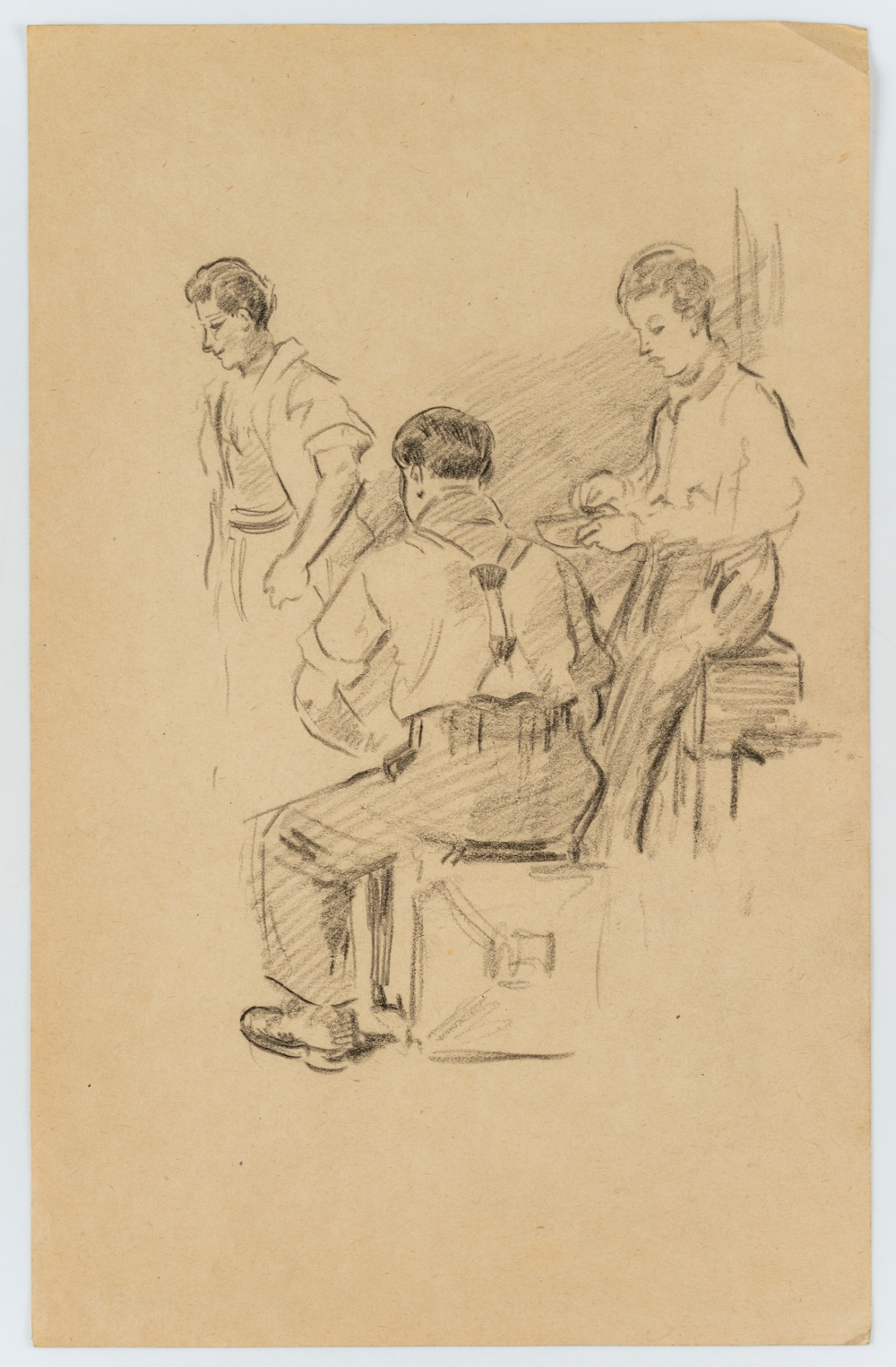 Jan Wiegman (*1884 Zwolle), Zeichnung von drei jungen Männern in Hemdsärmeln, , Kohle