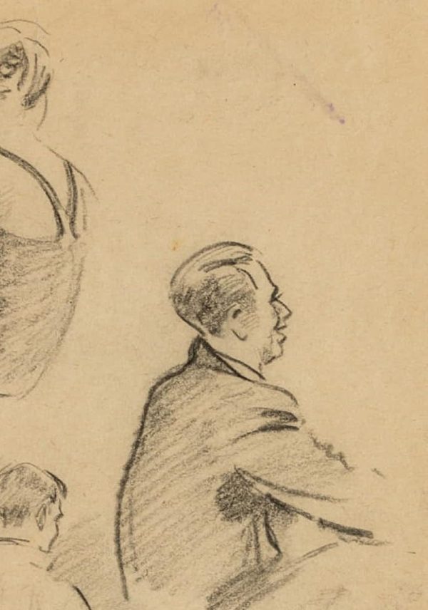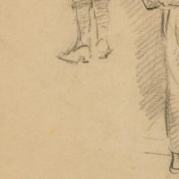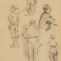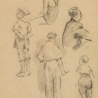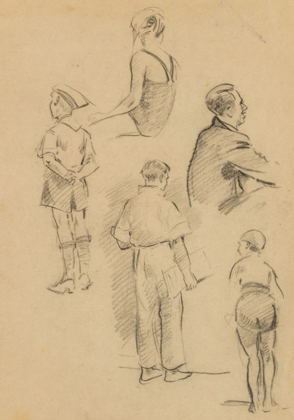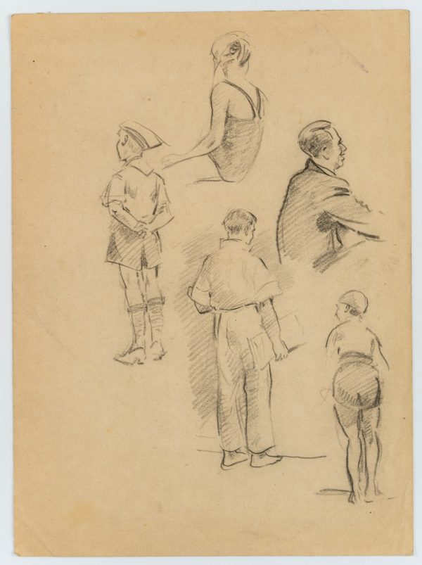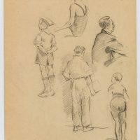- Description: Quick study sketches of adults and children in back view with special attention to posture and emphasis of the bodies through different clothing. Signed on the verso by the artist (?): “Jan Wiegman”.