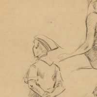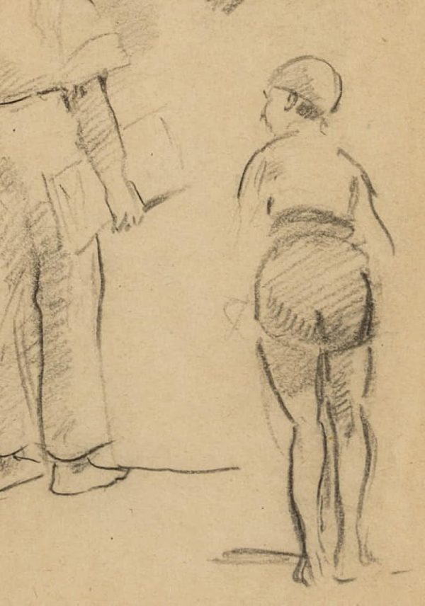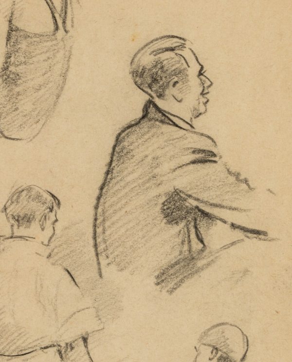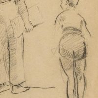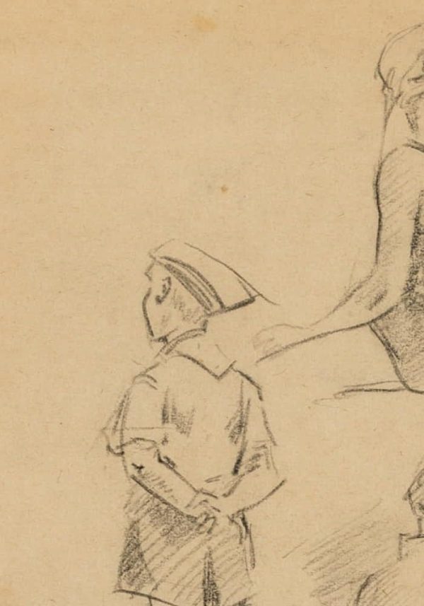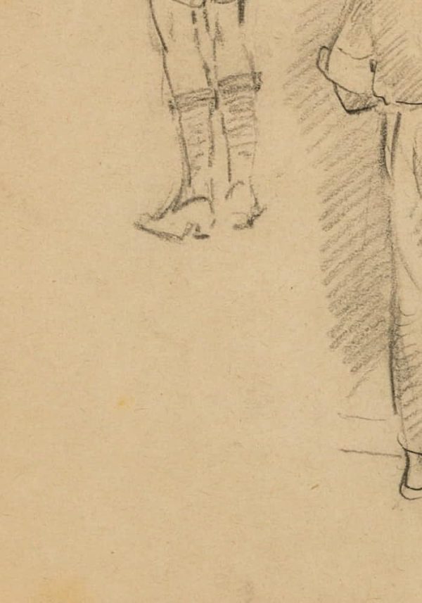 - Beschreibung: Schnelle Studienskizzen von Erwachsenen und Kindern in Rückenansicht mit besonderem Augenmerk auf Haltung und Betonung der Körper durch unterschiedliche Kleidung. Verso vom Künstler (?) signiert: “Jan Wiegman”.