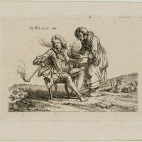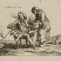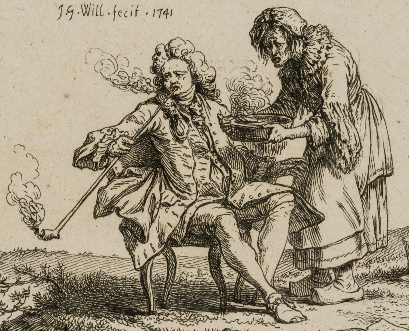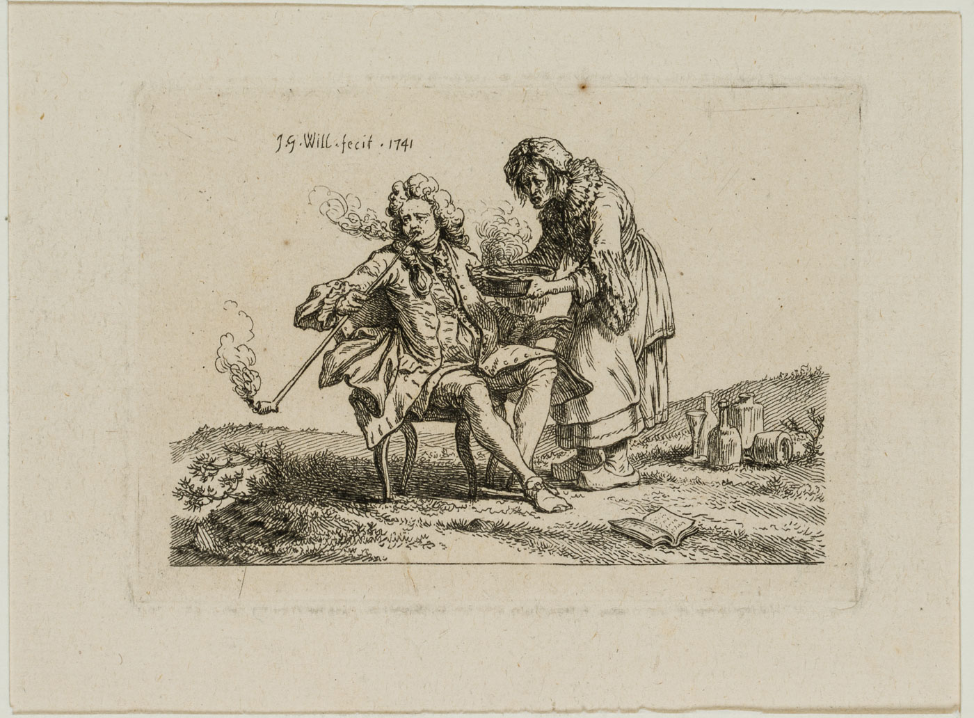 • Beschreibung: Auf einem Rasenstück auf einem Stuhl sitzend, erblicken die Betrachtenden einen mondän, in der Mode des 18. Jahrhunderts gekleideten Mann mit lockiger Perücke. Eine lange Pfeife in der Hand haltend, raucht der Mann und blickt mit einem leidenden Gesichtsausdruck über seine rechte Schulter hinweg. Eine ältere Frau, vermutlich seine Bedienstete, bringt eine Schüssel mit einem dampfenden Gebräu herbei. Zahlreich Flaschen und ein aufgeschlagenes Buch zu seinen Füßen lassen den Eindruck erwecken, der Raucher versuche ein Leiden zu mildern.