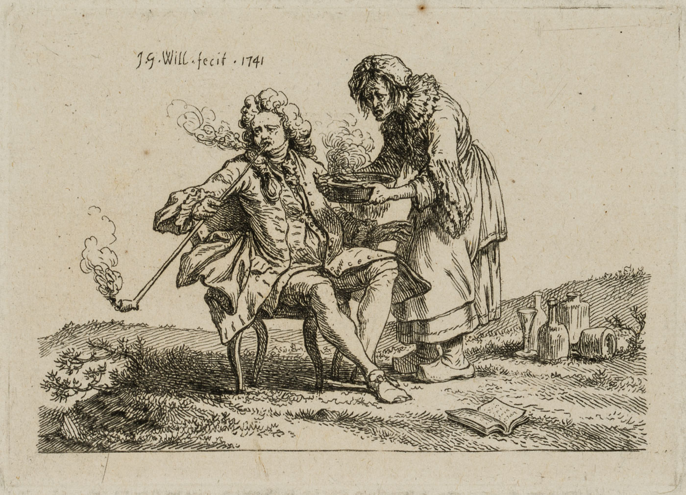 • Description: Sitting on a chair on a patch of grass, the viewers catch sight of a sophisticated man dressed in 18th century fashion with a curly wig. Holding a long pipe in his hand, the man smokes and looks over his right shoulder with a suffering expression. An elderly woman, presumably his servant, brings a bowl of steaming brew. Numerous bottles and an open book at his feet give the impression that the smoker is trying to alleviate a suffering.