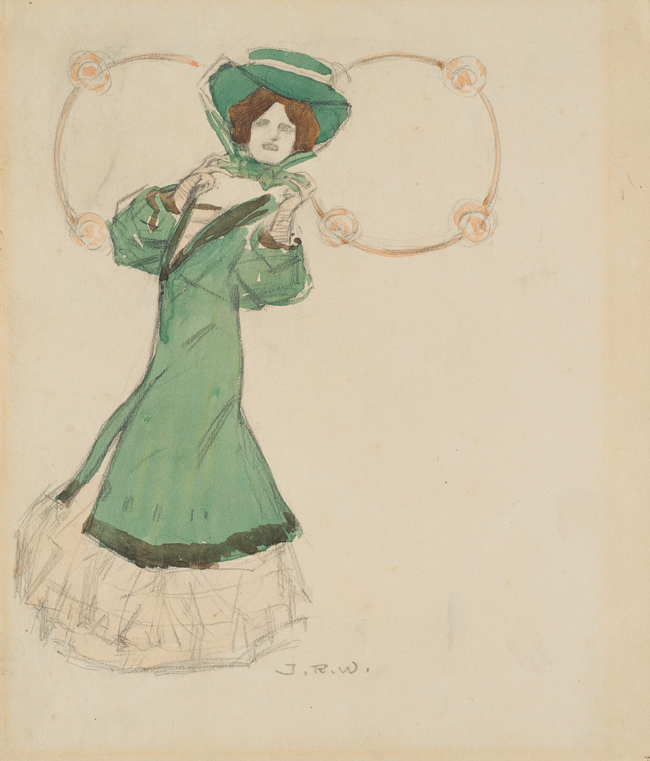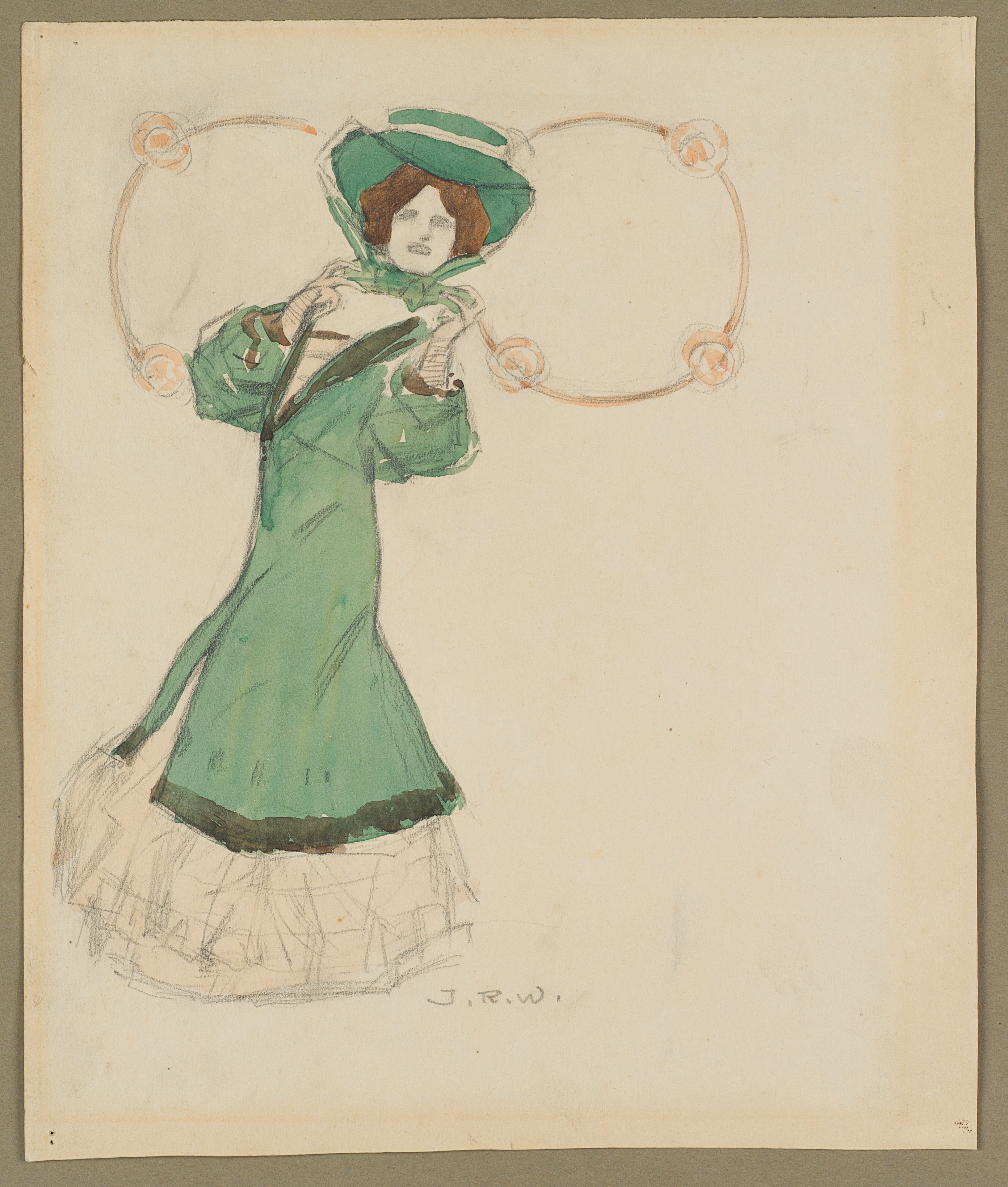 - Description: Depiction of a lady in a green dress and hat surrounded by ornamental decorations.